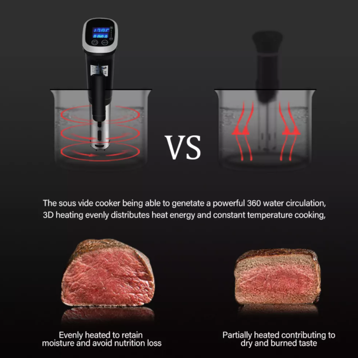 - Sous vide là phương pháp nấu hiệu quả nhất đối với những loại thịt có kết cấu phức tạp. Nhờ mức nhiệt thấp trong môi trường ẩm nóng, các mô liên kết phức tạp của thịt sẽ từ từ biến thành gelatin, giúp món ăn trở nên thơm ngon hơn.Cũng nhờ phương pháp sous vide, bạn sẽ có được thành phẩm là món ăn chín mềm, ngọt hơn và loại bỏ được quá trình oxy hóa, ngăn ngừa sự phát triển của vi sinh. Có thể nói với cách chế biến này, món ăn sẽ gần như giữ được hương vị nguyên bản. Ưu điểm khi sử dụng thiết bị nấu chậm sous vide trong chế biến thực phẩm - Giữ nguyên được dưỡng chất, độ ngon của thực phẩm