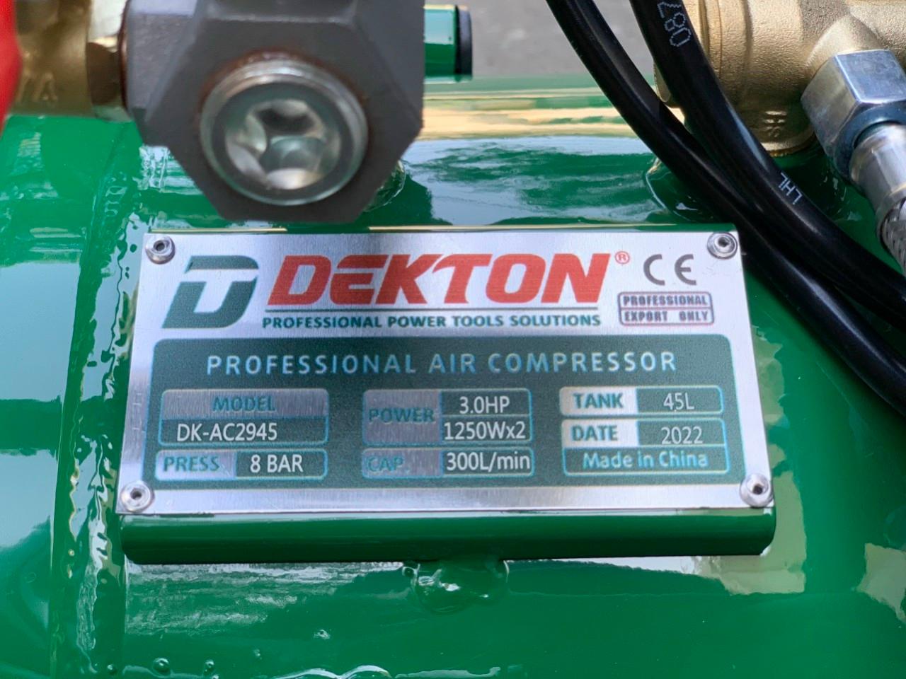 Thông số kỹ thuật -Model: DK-AC2945 -Thương hiệu: Dekton -Sản xuất: Trung Quốc -Công suất: 3HP – 2500W -Điện áp: 220v-240v/50hz -Áp lực: 8bar -Tốc độ lên hơi: 150 L/Phút -Trọng lượng : 31kg -Bình chứa: 45L -Bảo hành: 6 tháng