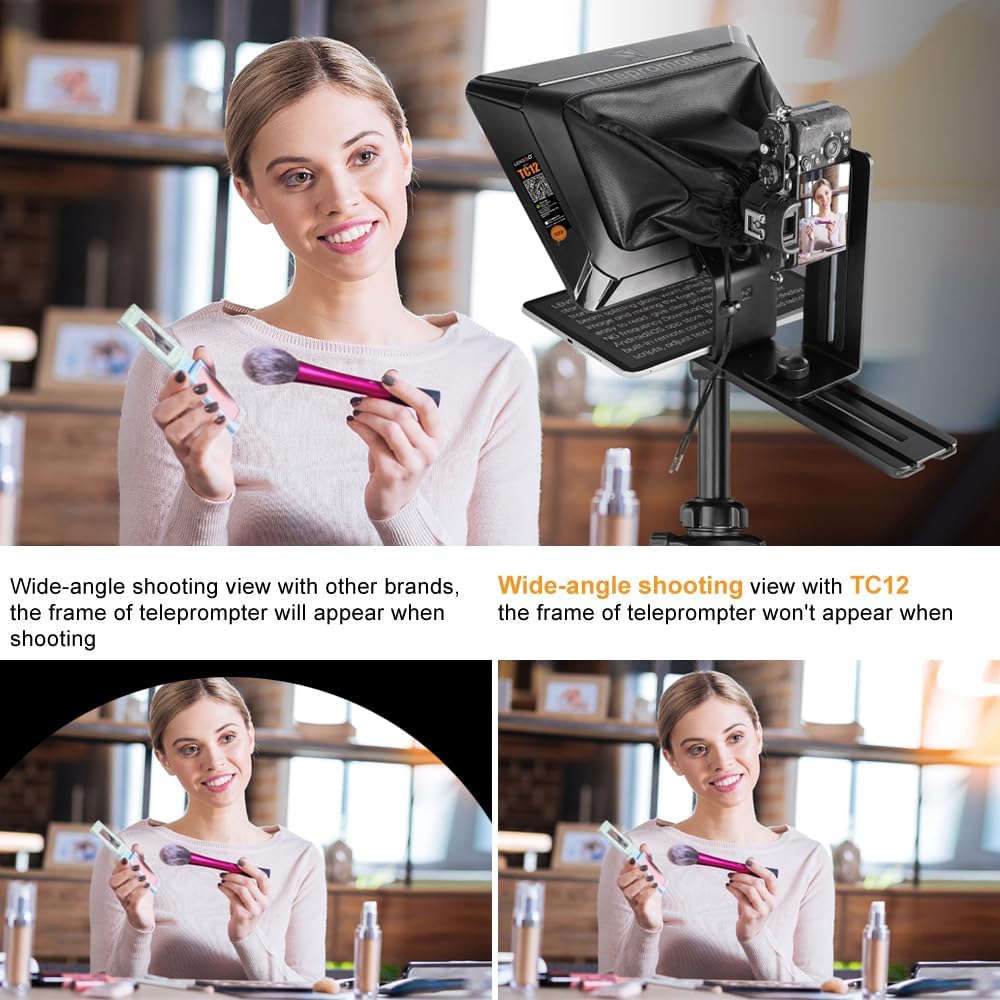 Máy nhắc chữ Lensgo TC12 thiết kế chắc chắn cứng cáp từ hợp kim nhôm, tháo lắp dễ dàng, kính phân tách chùm tia trong suốt 12 inch, khả năng truyền sáng 70% giúp phản chiếu rõ nét, hỗ trợ chụp ngang/ dọc với góc chụp rộng, tương thích với nhiều dòng máy tính bảng cỡ lớn, nhắc chữ thông qua ứng dụng với điều khiển bluetooth, thích hợp để phỏng vấn, làm vlog, quay phát trực tiếp,...