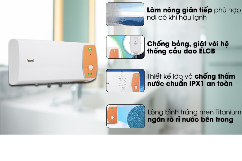 Bình nước nóng gián tiếp Ferroli QQAE 30Lít - Bình tráng Titan siêu bền bảo hành dài hạn - Lớp phủ men xanh vĩnh cửu - Thanh nhiệt tráng men siêu bền, chống bám cặn