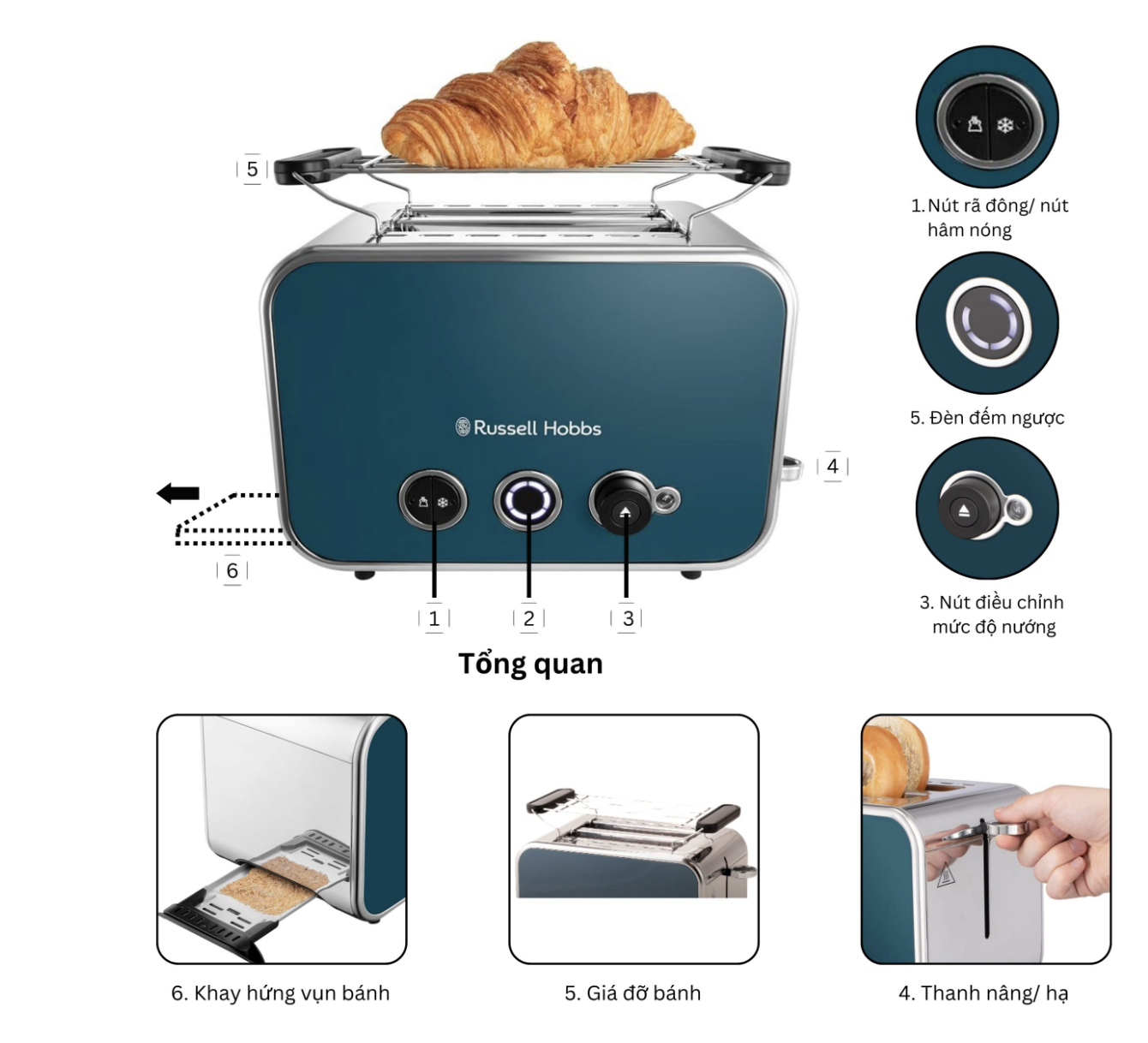 Sáu mức độ nâu có thể điều chỉnh Kẹp bánh mì nướng tích hợp Hai khe nướng bánh mì cực rộng Tự động định tâm bánh mì Đầu gắn bánh mì và ngăn đựng vụn