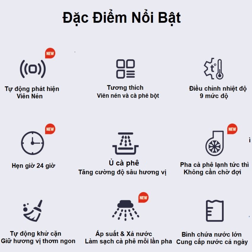 - Chức năng pha cà phê: Espresso, Viên Nén Nespresso, Nescafe Dolcegusto, Kcup