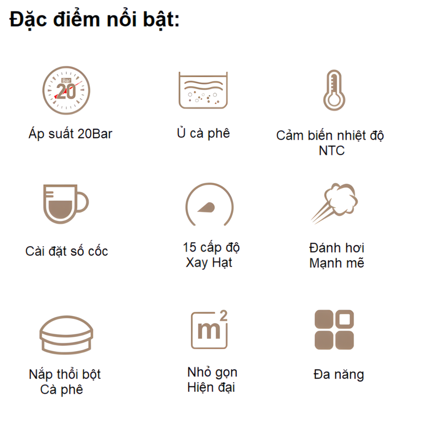 - Chức năng pha cà phê: Cappuccino, Espresso, Latte