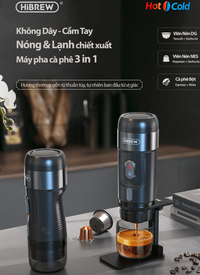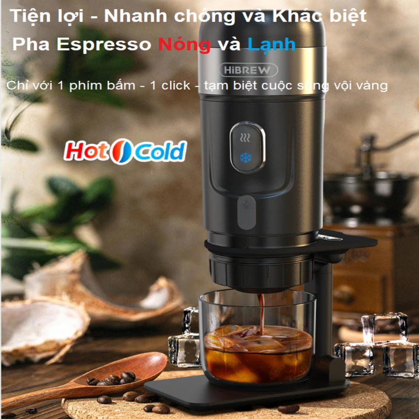 Máy pha cà phê cầm tay Espresso 3 trong 1 thương hiệu HiBREW H4A, H4B sử dụng được trên ô tô, áp suất 15bar Máy pha cà phê cầm tay Espresso mini 3 trong 1 HiBREW H4A Pha Cafe Espresso, Cà Phê Viên Nén, Nóng Và Lạnh Là dòng máy pha cà phê đa năng phù hợp sử dụng cho các chuyến du lịch, picnic, dã ngoạ