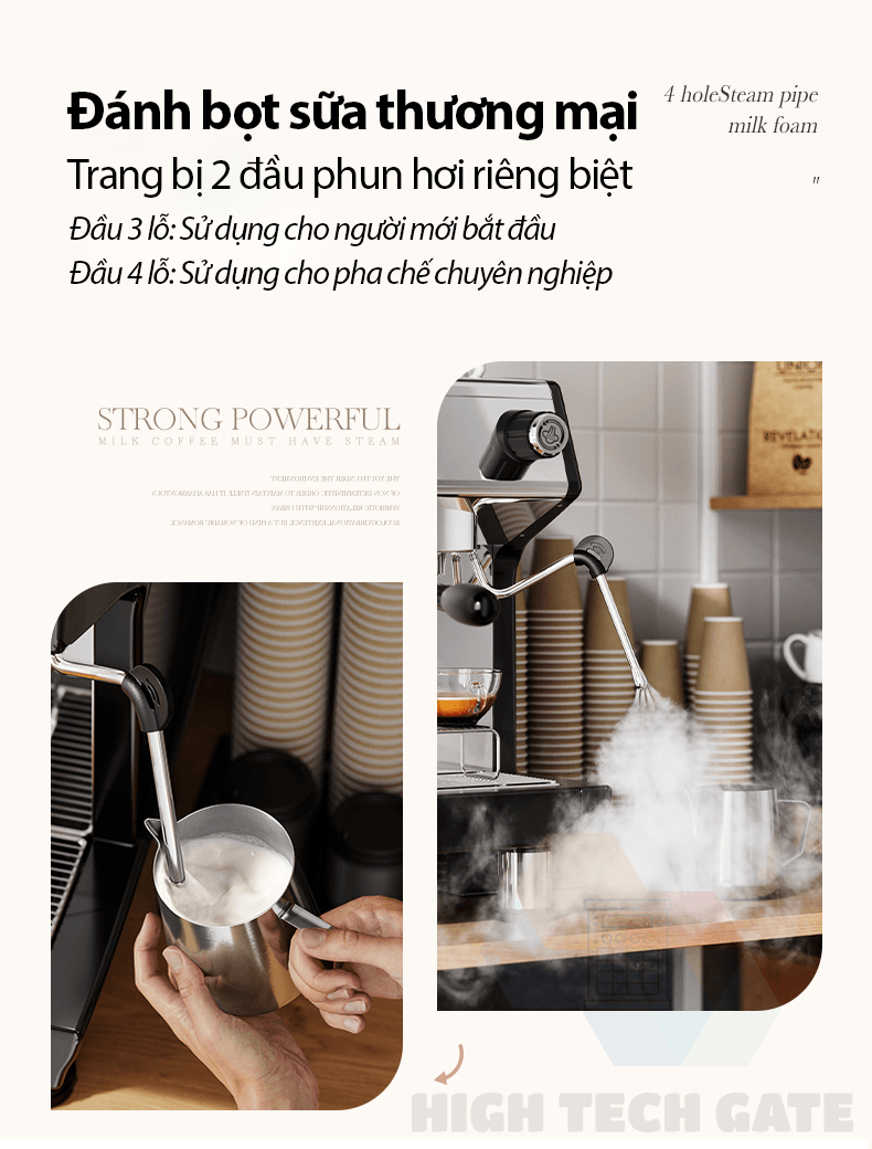 - Trang bị 2 đầu dẫn xả 3 lỗ và 4 lỗ, giúp thuận tiện cho các tệp khách hàng mới học pha chế hoặc chuyên nghiệp Barista trong quá trình sử dụng