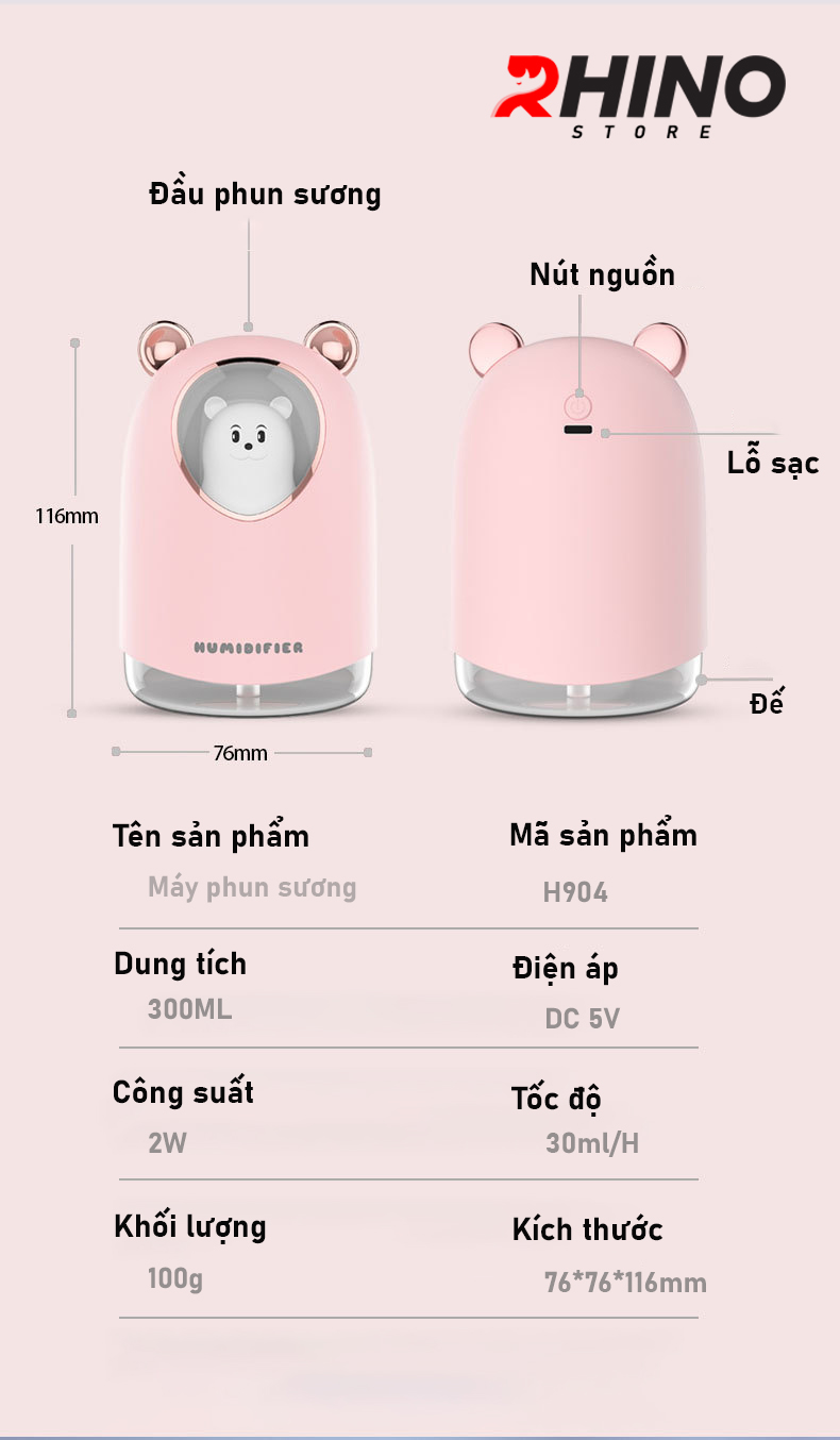 ✨Máy phun sương tạo ẩm Rhino H904 dung tích 300ml, nhỏ gọn, không gây tiếng ồn, tích hợp đèn ngủ RGB nhiều màu - Hàng chính hãng