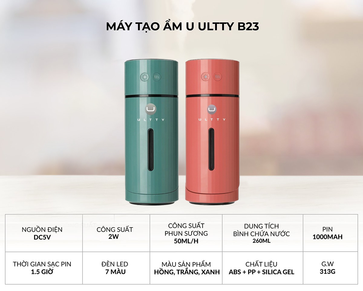 Máy tạo độ ẩm U ULTTY B23 là máy tạo độ ẩm không khí không dây nhỏ gọn có chức năng đèn ngủ, chạy bằng pin tích hợp. Công nghệ phun Nano có thể giảm khô hiệu quả, giảm bức xạ điện tử, loại bỏ tĩnh điện, an toàn và sạch sẽ, phù hợp sử dụng cho cá nhân, phòng đơn trong gia đình, văn phòng và trên xe ô tô. Công nghệ phun sương nano Chất lỏng được chuyển hóa thành dạng nguyên tử nano nhỏ như hạt sương nên có độ phủ rộng hơn, giúp cân bằng độ ẩm trong không khí nhanh hơn và giải quyết vấn đề thiếu độ ẩm của làn da, đồng thời kiểm soát được hết các bề mặt và tránh tình trạng đọng hơi nước trên nội thất gia đình hoặc trên xe. Thiết kế nhỏ gọn, không dây, linh hoạt với góc phun sương điều chỉnh xoay 90 độ -  Khắc phục nhược điểm của máy tạo ẩm thông thường, máy tạo ẩm U ULTTY B23 hỗ trợ điều chỉnh góc phun sương 90 độ. Điều này cho phép diện tích phun sương lớn hơn và giúp các phân tử nước nhỏ dưỡng ẩm sâu và tập trung hơn cho vùng da. -  Với kích thước nhỏ gọn 7.2 x 7.2 x 18 (cm), U ULTTY B23 hoàn hảo cho ô tô, máy tính để bàn hoặc phòng ngủ nhỏ.