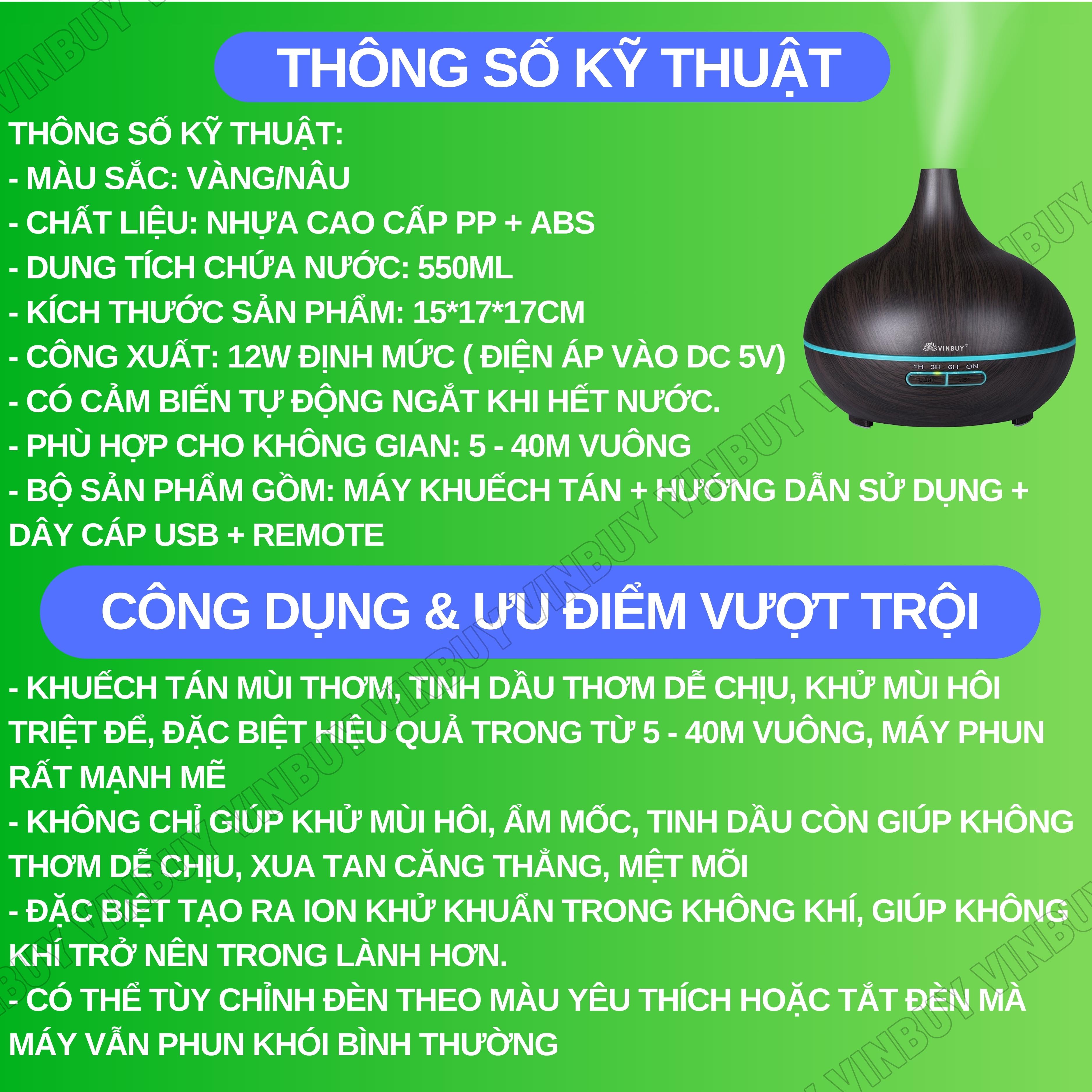 * Thông Số Sản Phẩm - Dung tích nước: 130ml - Diện tích khuếch tán: 20 - 30 m2 - Thời gian hoạt động liên tục: 4 giờ - Xuất sứ: nhập khẩu - Nguồn