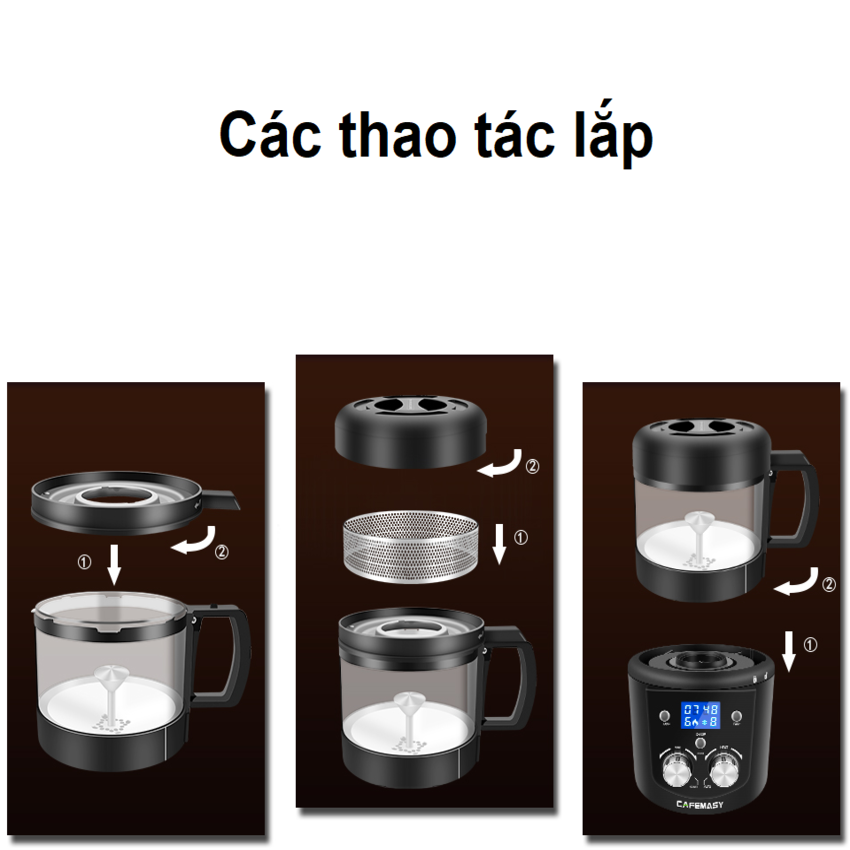 - Núm cài đặt hẹn giờ (1-15 phút) có thể điều chỉnh và làm nóng rang (1-8 cấp), nhiệt độ tự động không đổi, đảm bảo làm nóng đều khi rang. Máy rang cà phê thiết kế chuyên nghiệp