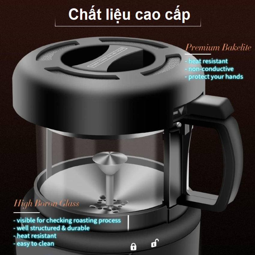 - Thân máy bằng nhựa ABS chịu nhiệt cao cấp, có nắp đậy bằng nhựa Bakelite & thiết kế tay cầm an toàn. Hũ nướng thủy tinh boron cao cấp chịu nhiệt trong suốt, có thể dễ dàng kiểm tra sự thay đổi màu sắc của hạt cà phê trong quá trình nướng. Với giỏ thu gom bã cà phê, giúp việc vệ sinh trở nên thuận tiện hơn. Chức năng rang & làm mát không khí 2 trong 1
