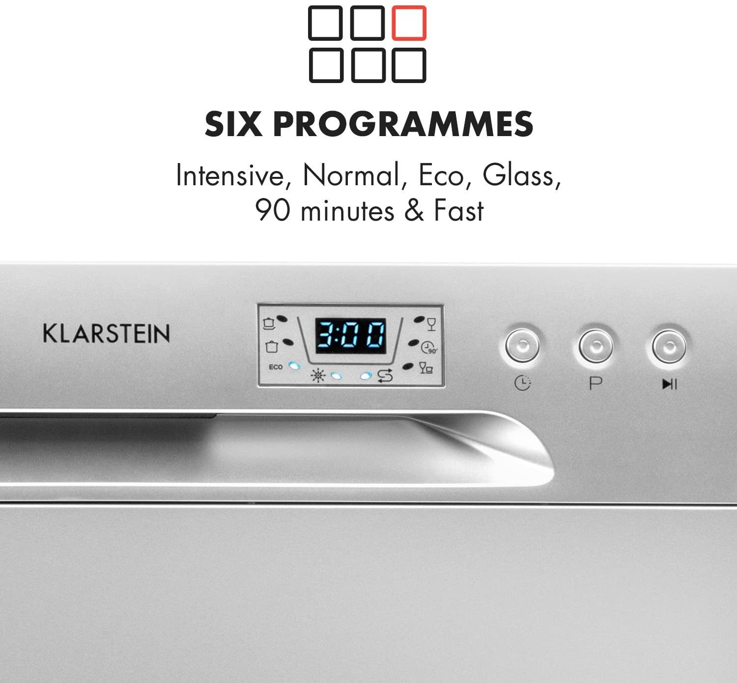 Ưu điểm của máy rửa bát Klarstein Amazonia 8 - Máy rửa bát mini thanh lịch với công suất tối đa 1620 W và không gian cho 8 bộ bát đĩa. - Mặt trước sang