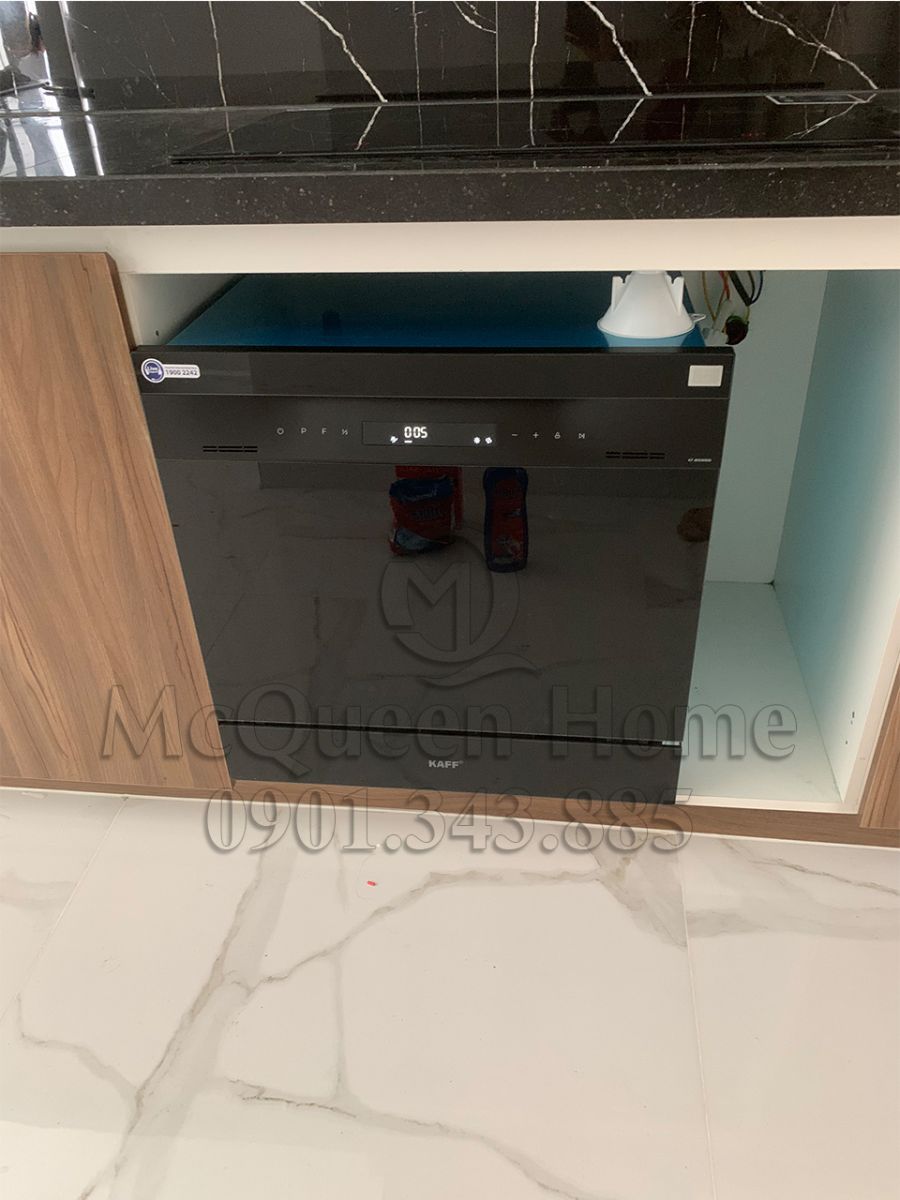 MÁY RỬA BÁT KAFF KF-BISW800 | LẮP ÂM TỦ HOẶC ĐỘC LẬP | 8 BỘ | MÀU ĐEN | NHẬP KHẨU NGUYÊN CHIẾC TỪ CHLB ĐỨC | THIẾT KẾ SANG TRỌNG | HỆ ĐIỀU KHIỂN CẢM ỨNG LINH HOẠT | AN TOÀN, BỀN BỈ VÀ TIẾT KIỆM ĐIỆN NĂNG   MÁY RỬA CHÉN ÂM TỦ KAFF KF-BISW800   Từ khi ra mắt trên thị trường máy này đã nhanh chóng nhận được rất nhiều phản hồi tích cực. Liệu rằng đằng sau vẻ đẹp sang trọng vốn có đó, máy rửa bát Kaff KF-BISW800 có điểm gì ưu việt đáng để lựa chọn và tin dùng?   Hiện tại có rất nhiều thương hiệu máy rửa bát trên thị trường trong đó máy rửa bát Kaff KF-BISW800 được người dùng yêu thích và tin dùng nhiều nhất. Đây là loại máy rửa bát mini cho phép người dùng rửa tối đa 8 bộ bát đĩa Châu Âu. Loại máy này do thương hiệu Kaff nhập khẩu và phân phối, sử dụng linh kiện chính hãng, đạt tiêu chuẩn năng lượng Châu Âu: A++, cho chất lượng máy vượt trội.   So với các loại máy rửa bát thông thường khác, loại máy rửa bát Kaff KF-BISW800 có nhiều ưu điểm vượt trội hơn, cho phép rửa được cả xoong nồi chảo. Dòng máy này rất thích hợp cho các gia đình ít người, từ 2-4 thành viên hoặc hộ gia đình có nhu cầu sử dụng ít.   ĐẶC ĐIỂM NỔI BẬT   Tổng quan thiết kế Máy rửa bát Kaff KF-BISW800 có thiết kế hình chữ nhật dọc, có kích cỡ R595 x S480 x C595 mm. Nhìn bề ngoài, máy có hình dạng như một chiếc tủ lạnh mini, khá nhỏ gọn và tiện ích, dễ dàng di chuyển tới nhiều vị trí khác nhau trong căn bếp gia đình.   Máy rửa bát Kaff KF-BISW800 được thiết kế dạng âm tủ. Người dùng có thể linh hoạt đặt trên mặt bàn hoặc lắp âm tủ đều được. Tuy nhiên, nếu muốn lắp đặt âm thì cần phải đảm bảo diện tích khoang tủ lớn hơn kích thước của máy, để dễ dàng sử dụng và vệ sinh.   Máy rửa bát 8 bộ Kaff KF-BISW800 có nhiều điểm ấn tượng, độc đáo và mới lạ hơn so với nhiều loại máy rửa bát thông thường. Chất liệu của máy là thép không gỉ, bền chắc, toàn thể máy sử dụng tông màu đen bóng sạch, đẹp tạo cảm giác sang trọng, hiện đại.   Mặt trước Mặt trước của máy rửa bát Kaff KF-BISW800 có phần tay vịn, bên trong là khoảng trống hở để người dùng dễ dàng nắm được và kéo ra khi cần. Tay vịn được làm bằng chất liệu inox 304. Chi tiết hoàn thiện tỉ mỉ và được gắn chắc chắn trên mặt cánh của máy.   Phía dưới thanh tay vịn là bảng điều khiển của máy, chứa các phím bấm hiện đại, mỗi phím bấm đều có biểu tượng đi kèm và cụm từ tiếng anh tương ứng. Nếu người dùng chưa quen với việc sử dụng tiếng anh, khi mua máy rửa bát sẽ đi kèm sách hướng dẫn sử dụng để giới thiệu chi tiết các tính năng của máy.   Tên thương hiệu được hiển thị ở chính giữa phía dưới chân máy rửa bát. Dưới cùng là phần đáy của máy rửa bát Kaff KF-BISW800. Phần đáy được ngăn cách với phần thân mới bởi 1 đường khe hở khoảng 1-2cm.   Mặt đáy Máy rửa bát Kaff KF-BISW800 có mặt đáy không bằng phẳng hoàn toàn như nhiều loại máy khác. Mặt đáy của máy có 4 trụ, tiếp xúc trực tiếp với sàn đất, làm bệ đỡ chính cho trọng lượng của máy. 4 trụ ở 4 góc đều được làm từ chất liệu thép không gỉ nên khả năng chịu lực tốt, chịu nhiệt và tính thích ứng với môi trường cao, không lo về vấn đề han gỉ, ẩm mốc.   Mặt đằng sau Mặt đằng sau sẽ toàn bộ khung màu đen, chứa ống thoát nước dài 158cm và ống cấp nước dài 154cm. Ngoài ra còn hệ thống dây điện dài 149cm. Tất cả những vật dụng liên quan đến dây điện, ống dẫn nước được sắp xếp ở mặt sau để tiết kiệm diện tích và đảm bảo tính thẩm mỹ cho máy rửa bát Kaff Kaff KF-BISW800.   Thiết kế bên trong Máy rửa bát Kaff KF-BISW800 có 2 khay rửa di động hay còn gọi là 2 giàn rửa bát đĩa. Khay trên là khay tiếp xúc gần sát với phần trán lắp trên của máy. Khay trên chủ yếu rửa các loại bát đĩa nhỏ, cốc, ly, vật dụng nhỏ không tốn diện tích.   Khay dưới của máy có khoang chứa rộng hơn, cho phép rửa các loại nồi nấu, chảo, bát đĩa ác loại đĩa thìa, người dùng có thể cho vào vào giỏ màu xám ở trong khay rửa dưới hoặc xếp làm ngang, sao cho các không có bất cứ vật dụng nào cản trở vào 2 tay quay gạt nước của máy.   Ở phía trong bên của máy rửa bát Kaff KF-BISW800 có chứa ngăn chứa muối và ngăn chứa các chất rác trong quá trình rửa. Người dùng cần dùng loại muối chuyên dụng cho máy rửa bát. Mỗi lần đổ muối sẽ dùng được khoảng 1,5 tháng - 2 tháng. Khi hết lượng muối cần thiết, máy sẽ báo hiệu ở trên bảng điều khiển.   Bên cạnh đó, phần cánh cửa đậy cần biết về ngăn đựng chất làm bóng và ngăn đựng viên tẩy rửa. Chất làm bóng giúp cho bát đĩa được sáng và bóng hơn, trong khi đó viên tẩy rửa là chất liệu quan trọng để đánh sạch mọi vết bẩn.   CÁC TÍNH NĂNG VÀ CHƯƠNG TRÌNH RỬA CỦA MÁY   Máy rửa bát Kaff KF-BISW800 có công suất tiêu