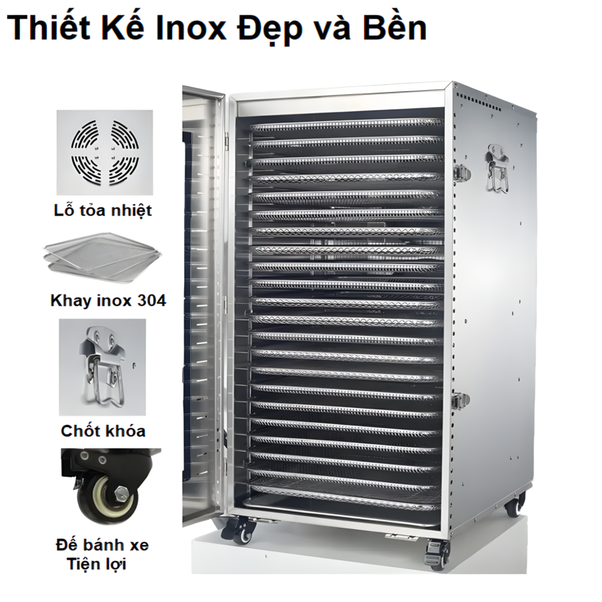 Đặc điểm máy sấy thực phẩm - Thùng sấy dung tích lớn lên tới 45L - Chế độ phân phối nhiệt theo phương ngang đồng đều - Có 12 khay lưới inox + 1 khay đặc hứng