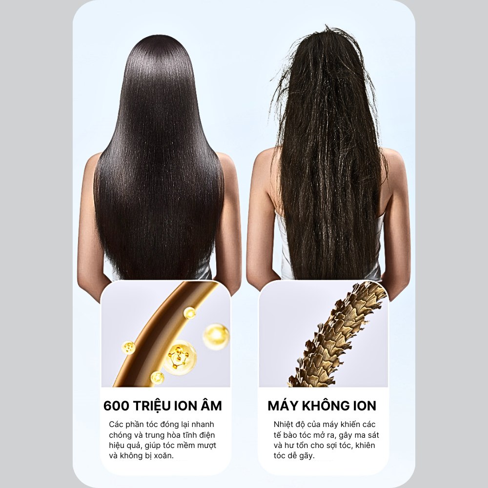Kích cỡ nhỏ gọn, Tốc độ gió mạnh 30 triệu ion âm mang đến mái tóc mềm mại và bóng mượt Chăm sóc ion Công suất cao 1600 W để sấy khô nhanh Máy