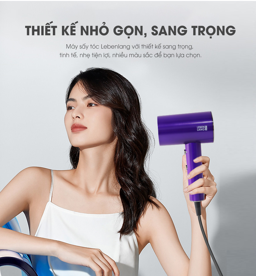 - Máy sấy tóc Lebenlang được thiết kế tinh xảo, sang trọng với 3 màu nổi bật: Cam, Tím, Đỏ; giúp khách hàng tùy chọn sắc màu theo sở thích của mình;