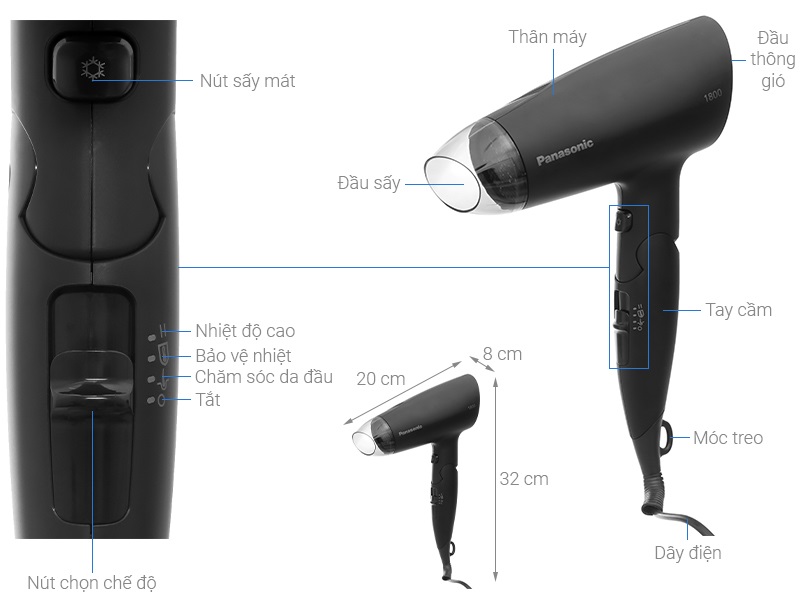 Máy sấy tóc Panasonic với thiết kế nhỏ gọn, dễ cầm nắm cùng công suất hoạt động mạnh mẽ 1800W giúp tóc nhanh khô, tiết kiệm thời gian sấy tóc Có 2 tốc độ sấy và chế độ sấy mát dễ dàng điều chỉnh qua nút gạt của máy Chế độ sấy mát tạo luồng gió mát làm khô tóc mỏng, yếu dễ dàng, bảo vệ chất tóc tối ưu. Bảo vệ da đầu và tóc nhờ chế độ chăm sóc da đầu và bảo vệ nhiệt Chế độ chăm sóc da đầu với nhiệt độ sấy khoảng 50°C giúp sấy khô tóc nhẹ nhàng. Còn chế độ bảo vệ nhiệt bảo đảm nhiệt độ của máy không quá nóng, làm hư tổn tóc và da đầu của bạn. Tay cầm máy sấy tóc có thể gấp gọn, tiện lợi, dễ dàng mang theo khi đi du lịch, công tác hoặc đơn giản là đặt gọn trên kệ tủ Máy sấy tóc trang bị móc treo tiện dụng, giúp bạn dễ dàng bảo quản sản phẩm Sử dụng máy sấy tóc an toàn: