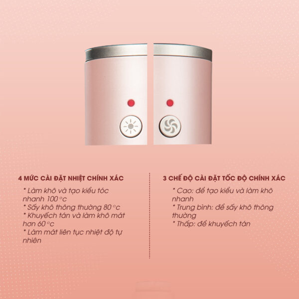 - 3 cấp độ gió với thể tích không khí lớn, 4 cấp độ nhiệt cho nhiều lựa chọn sấy