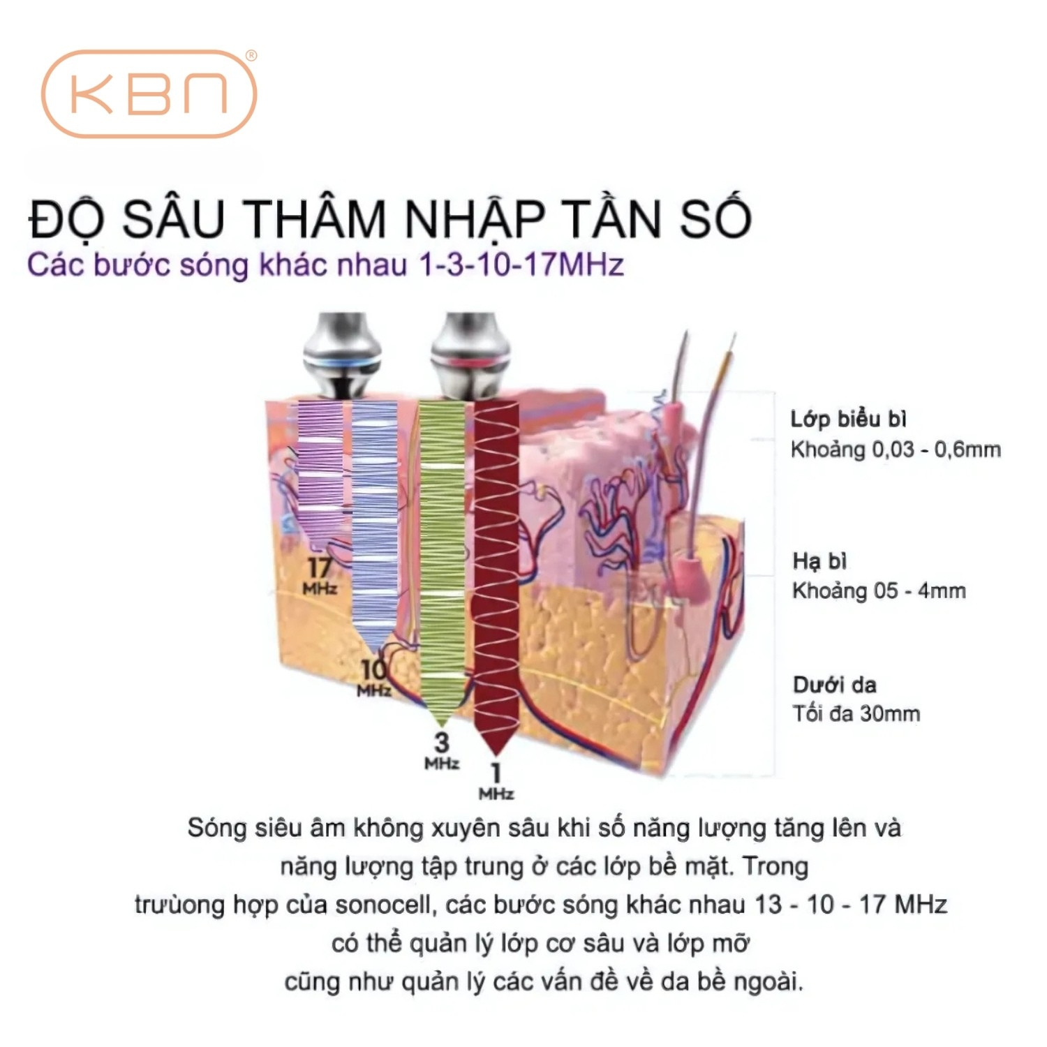 - Đa tầng bước sóng siêu âm kết hợp LED 1 – 3 MHz (LED đỏ): Giúp thư giãn cơ, massage bạch huyết, giảm sưng, chuẩn bị da trước trị liệu nâng cơ. 10 – 17 MHz (LED xanh): Làm dịu da, giảm viêm, thích hợp cho da nhạy cảm, phục hồi da tổn thương.
