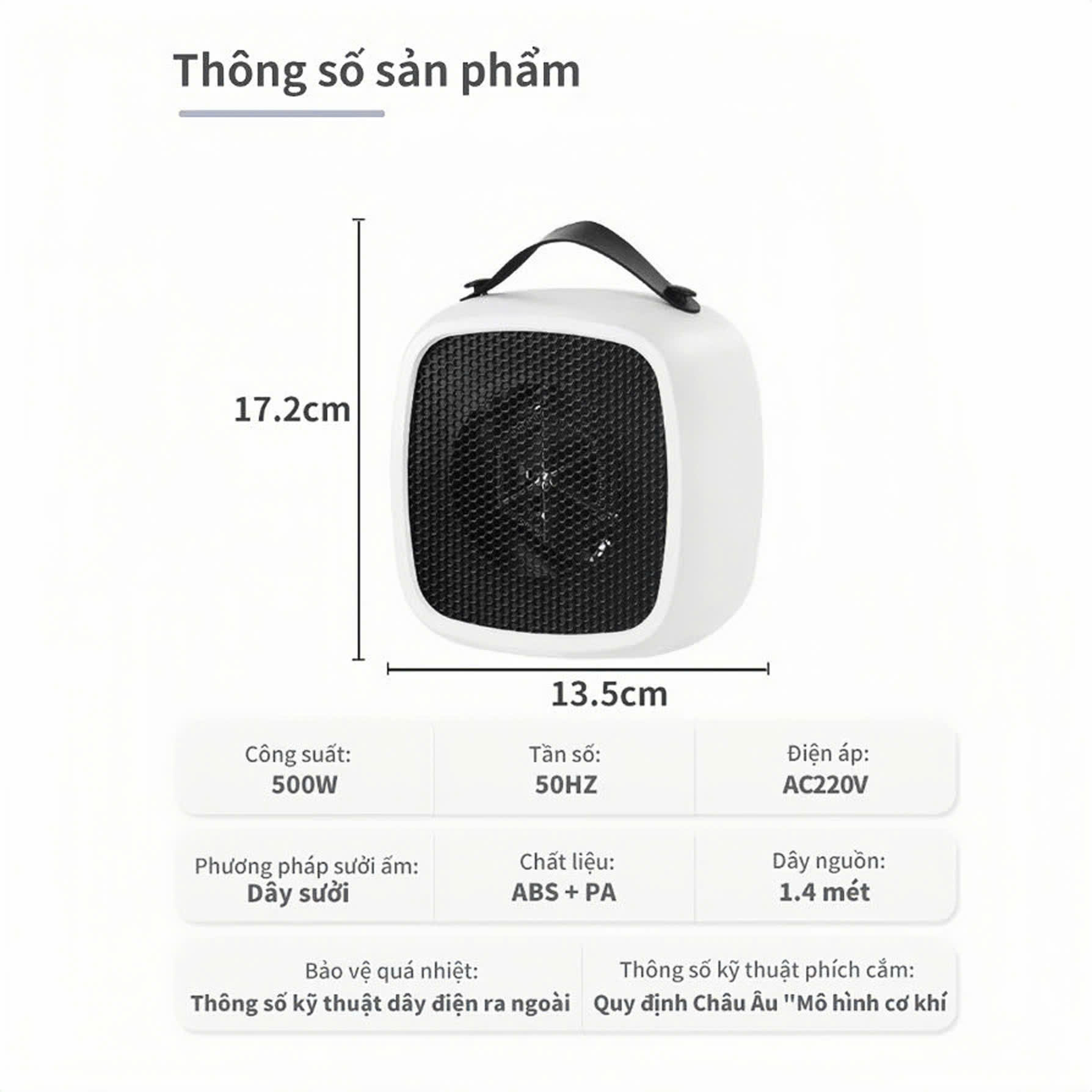 - Quạt sưởi mini nhỏ gọn có thể để trên bàn làm việc, bàn học rất tiện. THÔNG TIN SẢN PHẨM: