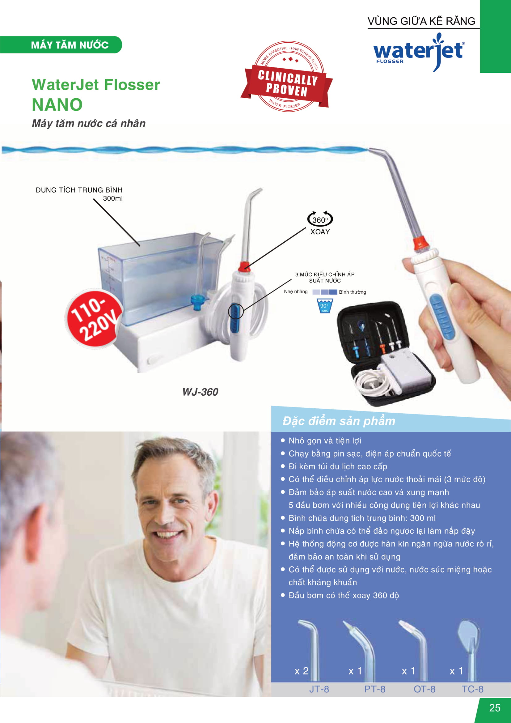 • Trọng lượng vận chuyển: 0.7 kg – Điện áp: AC 100-250V; 50-60 Hzt – 150m A/h; 4.8V – 5W – Bảo hành: 12 tháng   HƯỚNG DẪN SỬ DỤNG MÁY TĂM NƯỚC KHÔNG DÂY WATERJET CORDLESS NANO Hướng dẫn sạc pin: – Cắm cục sạc vào ổ cắm điện, đèn LED sẽ sáng màu xanh. – Cắm đầu còn lại vào lỗ sạc tại phía trước thân máy, đèn LED sẽ sáng màu đỏ. Khi màu đỏ đèn LED sáng lên, quá trình sạch điện bắt đầu. – Cần 15 giờ để sạc đầy pin. Mỗi lần sạc không được quá 20 giờ. Chuẩn bị nước: – Lấy bình chứa nước ra khỏi máy và cho nước vào. Đặt bình nước trở lại bên trên thân máy. Ấn bình nước sao cho gắn chặt vào thân máy. Gắn đầu tăm: – Chọn đầu tăm thích hợp và gắn vào tay cầm. Ấn cho đầu tăm gắn thật chặt.   Thay đổi áp suất của máy tăm nước Waterjet Cordless Nano: – Chỉnh áp suất đến mức ưa thích bằng cách trượt nút điều chỉnh lên xuống   Tay cầm điều khiển: – Máy tăm nước được trang bị nút tạm ngưng trên tay cầm. Bạn có thể tạm thời ngưng dòng nước bằng cách ấn nút tạm ngưng trê tay cầm. Điều khiển hướng của dòng nước bằng cách xoay nút phía trên tay cầm.   Mở/tắt máy tăm nước Waterjet Cordless Nano: – Sau khi đã đặt đầu tăm vào bên trong miệng, bật máy bằng tay còn lại. Mím môi để tránh nước bắn ra. Luôn luôn ấn nút tạm ngưng hay tắt máy khi rút đầu tăm ra khỏi miệng.   Bắt đầu sử dụng: – Đặt đầu tăm vào bên trong miệng, cúi thấp người xuống bồn nước. Mím môi để nước khỏi bắn ra, trong khi vẫn để nước chảy xuống bồn. Mở máy.   Để có kết quả tốt: – Hướng đầu tăm với răng tạo thành góc 90 độ. Bắt đầu với răng phía bên trong, di chuyển đầu tăm theo đường nướu, dừng lại trong một thời gian ngắn kẽ răng. Tiếp tục cho đến khi mọi điểm xung quanh và kẽ răng được làm sạch.   Khi sử dụng xong máy tăm nước Waterjet Cordless Nano: – Tắt máy, đổ phần nước còn lại đi.