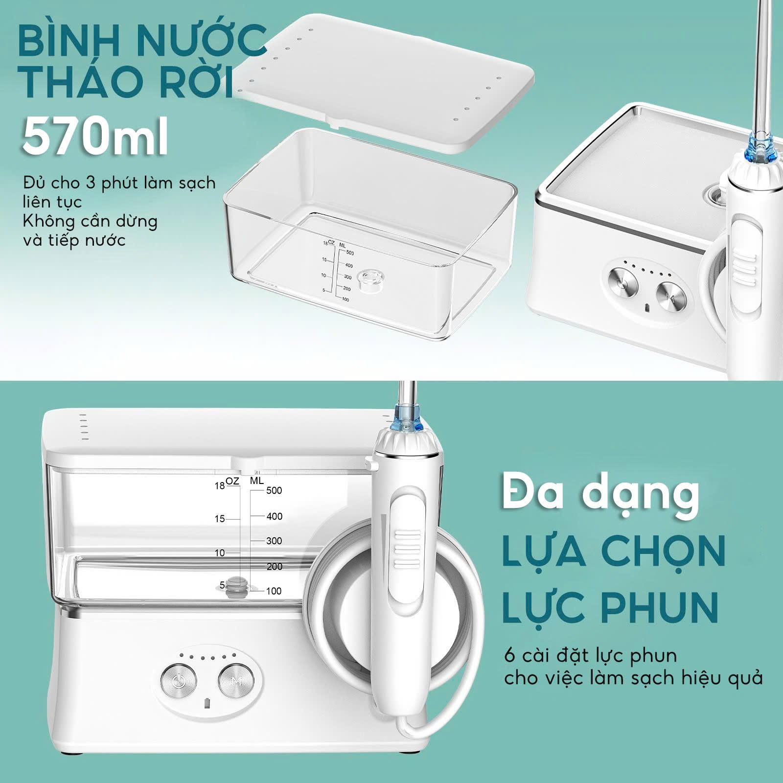 Máy tăm nước dùng trong gia đình Dung tích bình chứa nước 600ml Điện áp 100-240V Tần số 50/60Hz Công suất 18W Gồm 6 đầu tăm 10 mức áp lực nước