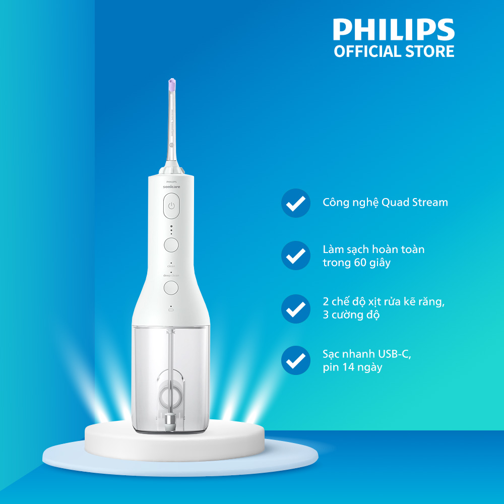 Làm sạch răng với công nghệ Quad Stream Đầu xịt Quad Stream được thiết kế độc đáo giúp làm sạch nhiều bề mặt răng hơn và ít tốn công sức hơn, làm sạch kỹ lưỡng kẽ răng để cải thiện sức khỏe nướu răng của bạn. Nhờ vậy, bạn có thể làm sạch răng bằng chỉ nha khoa đúng cách và đạt hiệu quả cao hơn mỗi khi sử dụng. THÔNG SỐ KỸ THUẬT: • Thương hiệu: Philips • Máy xịt rửa kẽ răng không dây: 1 • Đầu xịt tiêu chuẩn F1: 1 • Đầu xịt Quad Stream F3: 1 • Túi chứa: 1 • Dây cáp sạc pin USB: 1 • Bộ chuyển đổi USB gắn tường: 1 • Tay nắm: Thiết kế mảnh tiện dụng • Phụ tùng đầu xịt: Dễ dàng tháo lắp • Màu sắc: trắng • Xuất xứ: Trung Quốc   HƯỚNG DẪN SỬ DỤNG VÀ BẢO QUẢN: • Tham khảo HDSD đi kèm máy. • Bảo quản máy nơi khô thoáng.   PHILIPS CAM KẾT VỚI KHÁCH HÀNG: • Philips mang đến cho khách hàng những sản phẩm với chất lượng. • Dịch vụ khách hàng luôn tận tâm và nhiệt tình, giúp quý khách có được trải nghiệm hài lòng khi mua hàng. • Bảo hành quốc tế 2 năm.