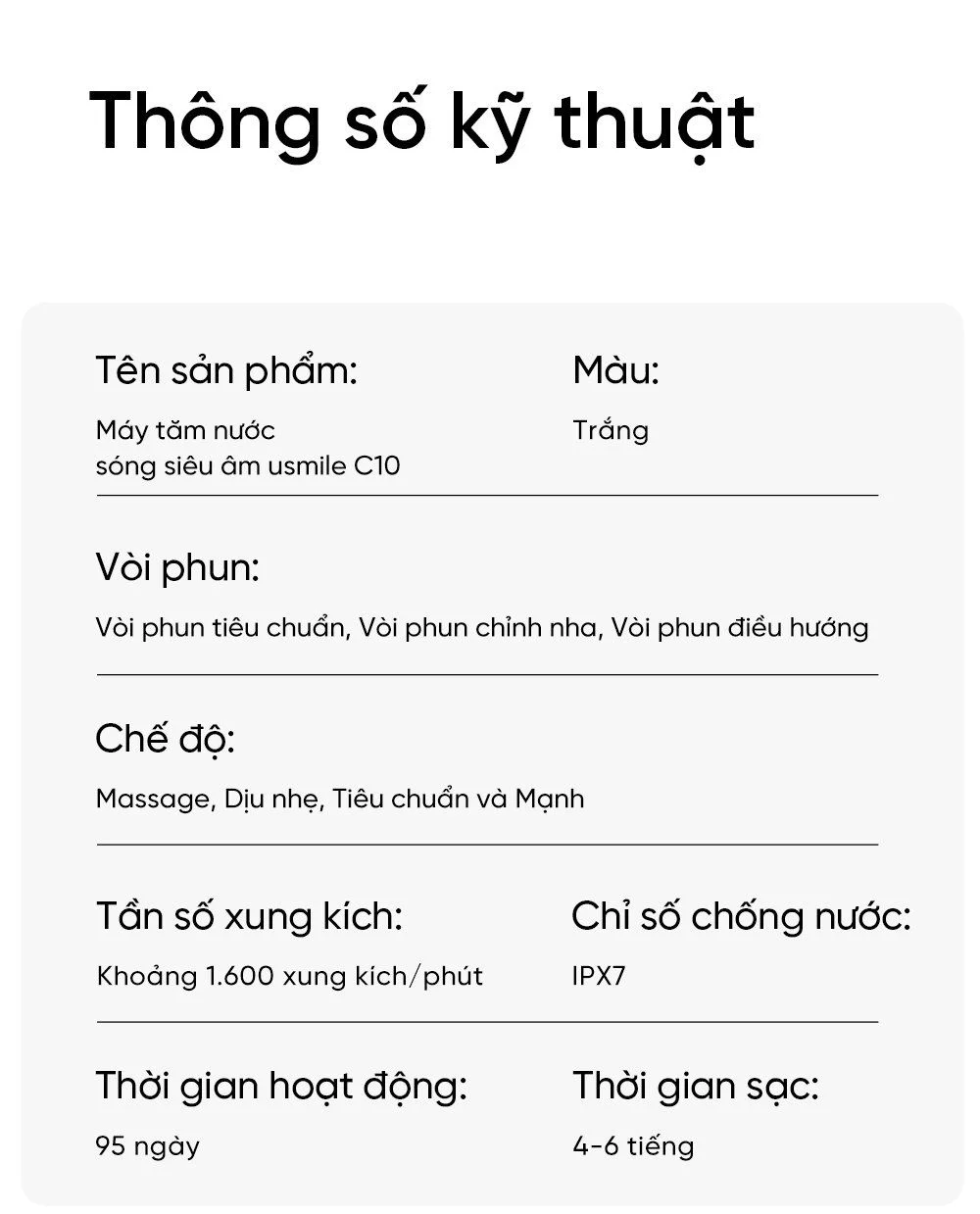 Ngoài ra, usmile C10 có thể hoạt động trong 95 ngày chỉ với 1 lần sạc khoảng 4 tiếng. Đồng thời, sản phẩm chống nước tốt với chỉ số IPX7, đảm bảo an toàn và dễ dàng sử dụng trong mọi tình huống.