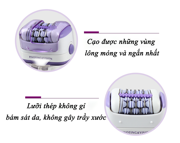 - Máy có đầu nhổ thông mình không trầy xước, có thể sử dụng với bọt gel tẩy lông - Đầu cạo lưỡi nổi động và tĩnh linh hoạt giúp cạo sát và nhanh