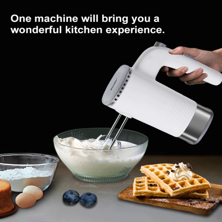 - Năm phụ kiện trộn an toàn và hợp vệ sinh: Máy trộn rộng hơn và móc trộn bột dễ dàng vệ sinh; máy trộn tay hoạt động mà không có tiếng ồn mạnh. Các phụ kiện mạ crom rất thích hợp để đánh bông lòng trắng trứng, các nguyên liệu làm kem và cho hỗn hợp bánh nhẹ hoặc bột đánh bông.