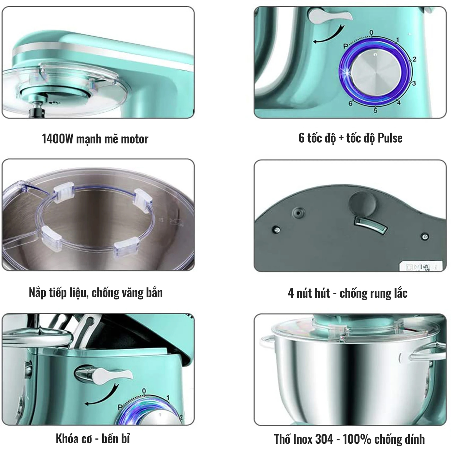 • Chất liệu: thép không gỉ• Công suất 2400W• Thể tích 5,5L• Tích hợp 10 cường độ trộn• Đầu xoay mạnh mẽ• Nắp đậy chống bắn bẩn• Đầu đánh tạo kem• Đầu nhào bột• Thương hiệu