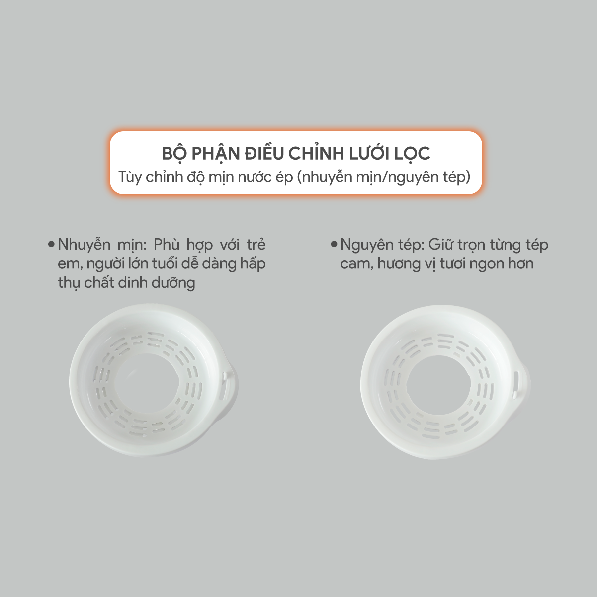 - Thiết kế hiện đại - Công Suất: 85W - Chất liệu: Nhựa - Máy có hệ thống ngăn hạt và lọc xác cam - Được trang bị 2 đầu vắt, cho phép bạn vắt