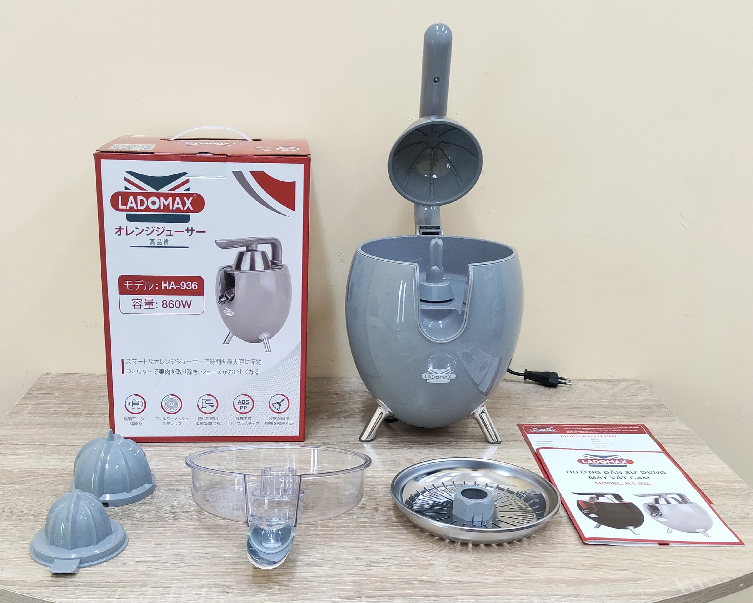 Thông tin sản phẩm Thương hiệu: Ladomax Máy: Máy vắt cam, vắt chanh Công suât: 860W Model :HA936 Núm: 2 đầu nấm lớn nhỏ Khay lọc: Inox Điện áp: 220-240V, 50/60HZ Bảo hành 12 tháng