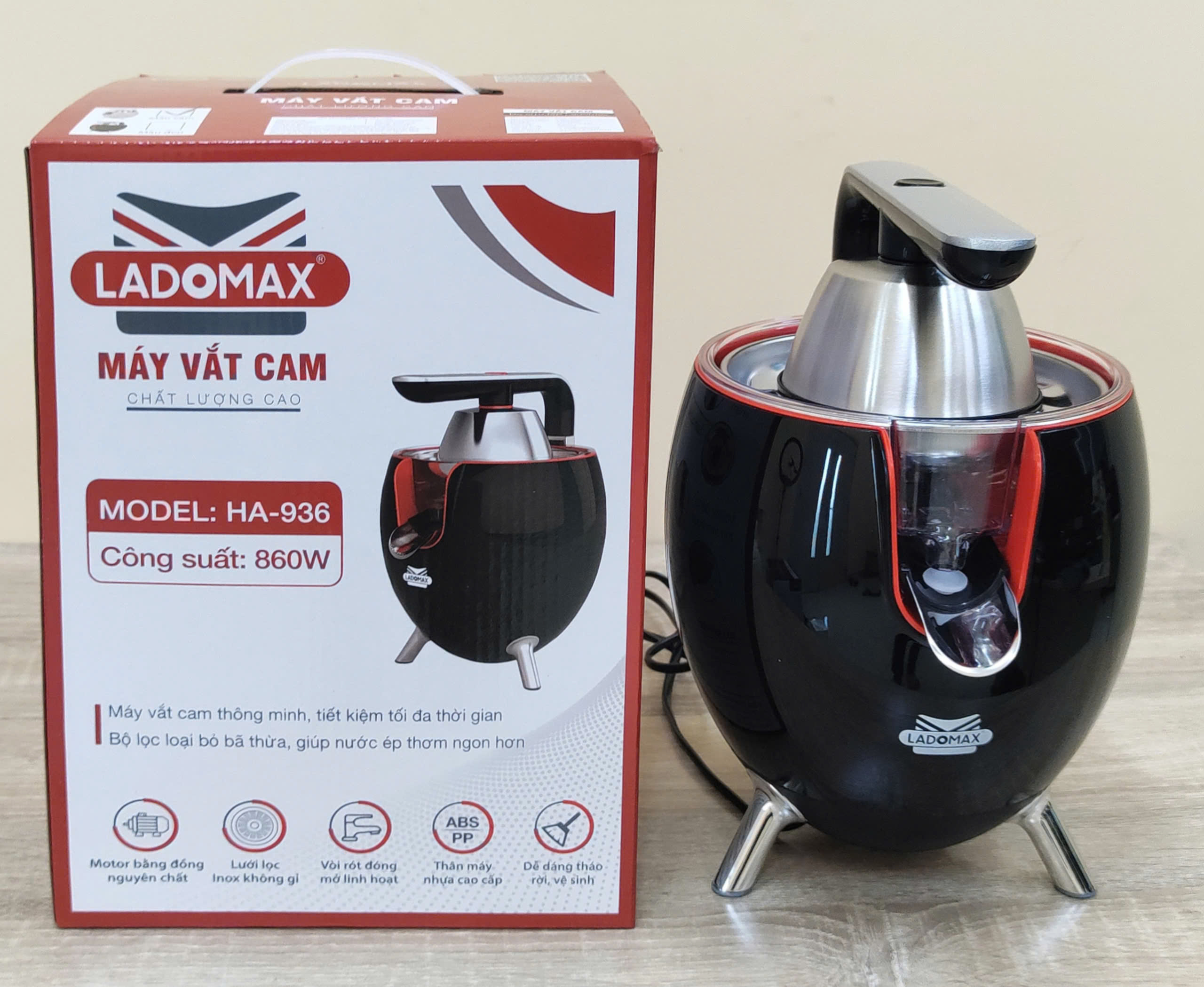Thông tin sản phẩm Thương hiệu Ladomax chính hãng Máy: Máy vắt cam công nghiệp Công suât: 860W Model : 936 màu đen Điện áp: 220-240V, 50/60HZ Bảo hành