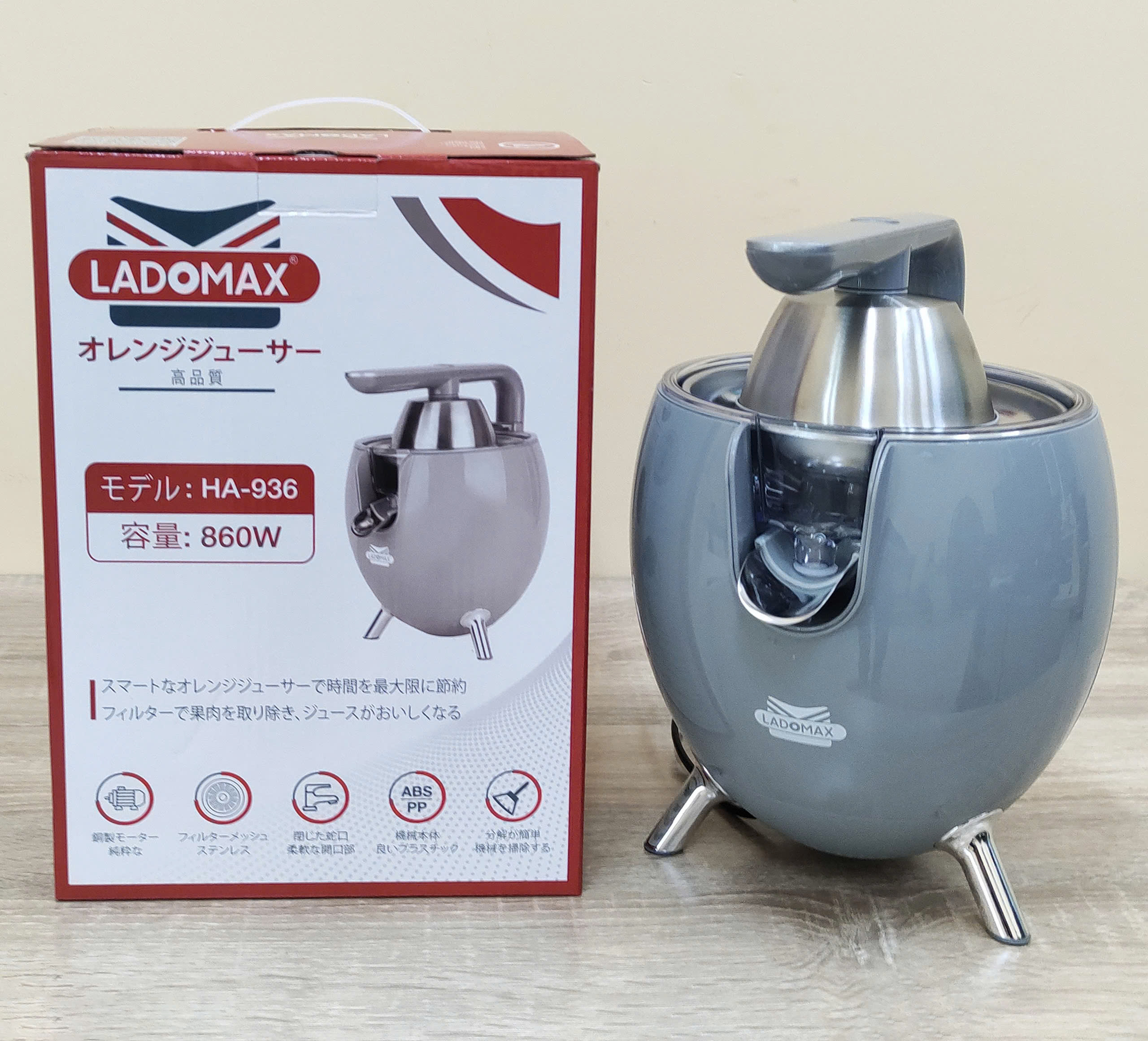 Thông tin sản phẩm Thương hiệu: Ladomax Máy: Máy vắt cam, vắt chanh Công suât: 860W Model :HA936 Núm: 2 đầu nấm lớn nhỏ Khay lọc: Inox Điện áp: 220-240V, 50/60HZ Bảo hành 12 tháng