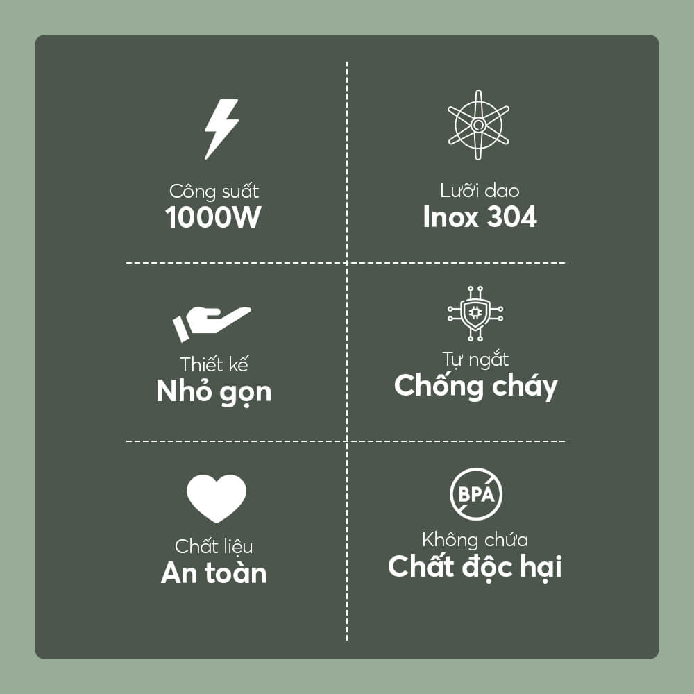 - Công suất 200W hoạt động bằng một nút bấm đơn giản - Lưỡi dao 2 cánh sắc bén bằng thép không gỉ - Thiết kế nhỏ gọn, trọng lượng chỉ 1,63kg - Cối thủy