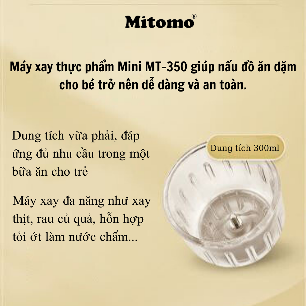 - Chế biến đồ ăn dặm cho bé vô cùng đơn giãn và tiện lợi, an toàn vệ sinh tôi đa. với máy MT-350 chỉ cần nhấn, nhã 2-3 lần thực phẩm sẽ được xay nhuyễn một cách nhanh chóng. Thống số kỹ thuật máy xay mini đa năng Mitomo MT-350