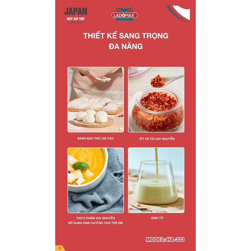 Thông tin sản phẩm - Tên sản phẩm: MÁY XAY THỊT ĐA NĂNG - Thương hiệu: LADOMAX - Model: HA-333 - Điện áp: 220V - 50Hz - Dung tích: 2L - Công suất: 400W -