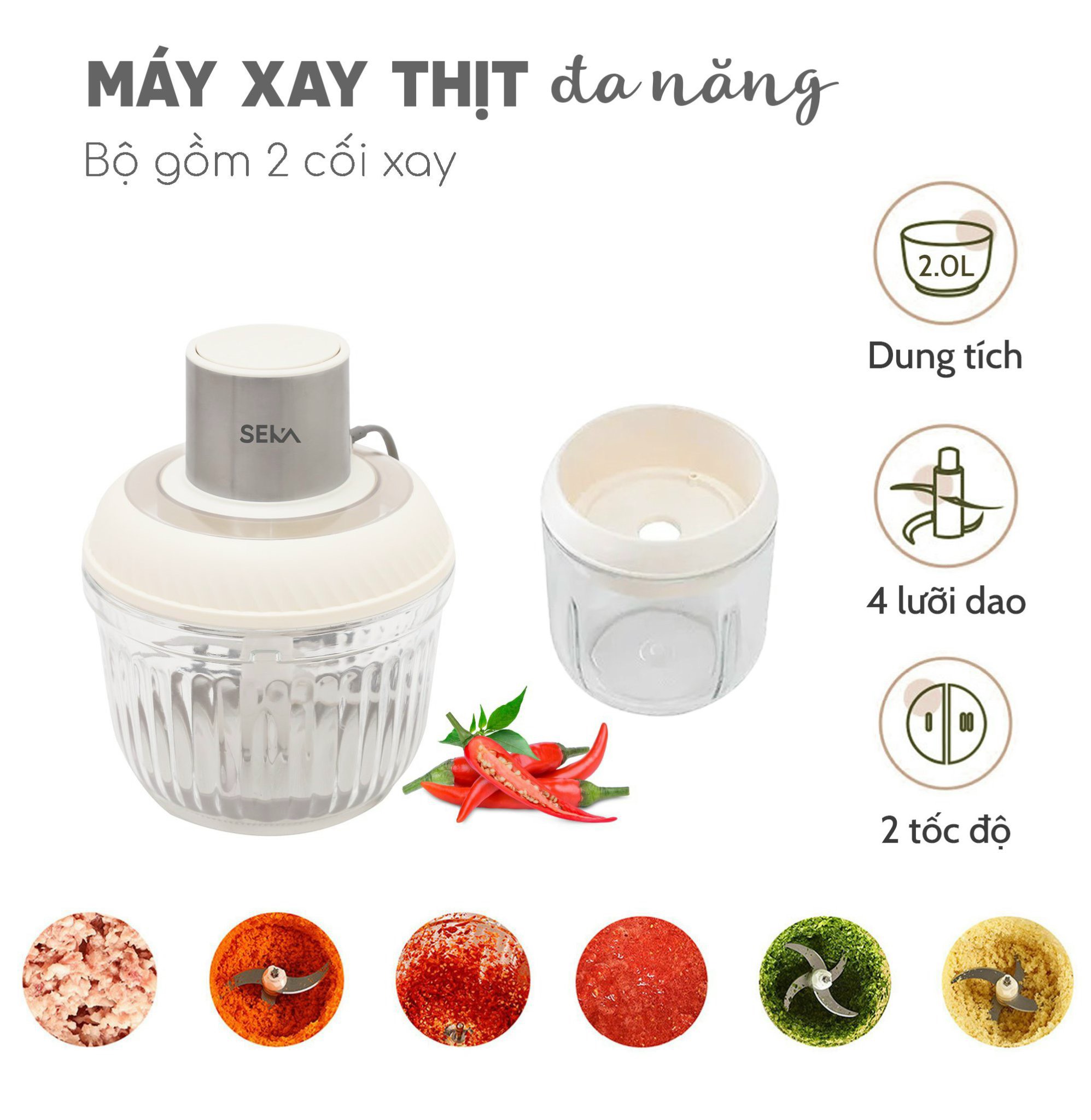Máy xay thịt đa năng SEKA SK2287, 2 cối thủy tinh, thiết kế 4 - 6 lưỡi dao sắc bén, Công suất mạnh 500W Với công suất mạnh mẽ và dung tích lớn 2L cùng với 2 cối SEKA SK2287 là công cụ xay cắt thực phẩm hoàn hảo cho đại gia đình. Bằng thao tác đơn giản, người dùng có thể dễ dàng chế biến đa dạng nguyên liệu tươi như thịt, hành, rau thơm, đậu phộng và nhiều thực phẩm khác. ĐẶC ĐIỂM NỔI BẬT CỦA MÁY XAY THỊT SEKA: