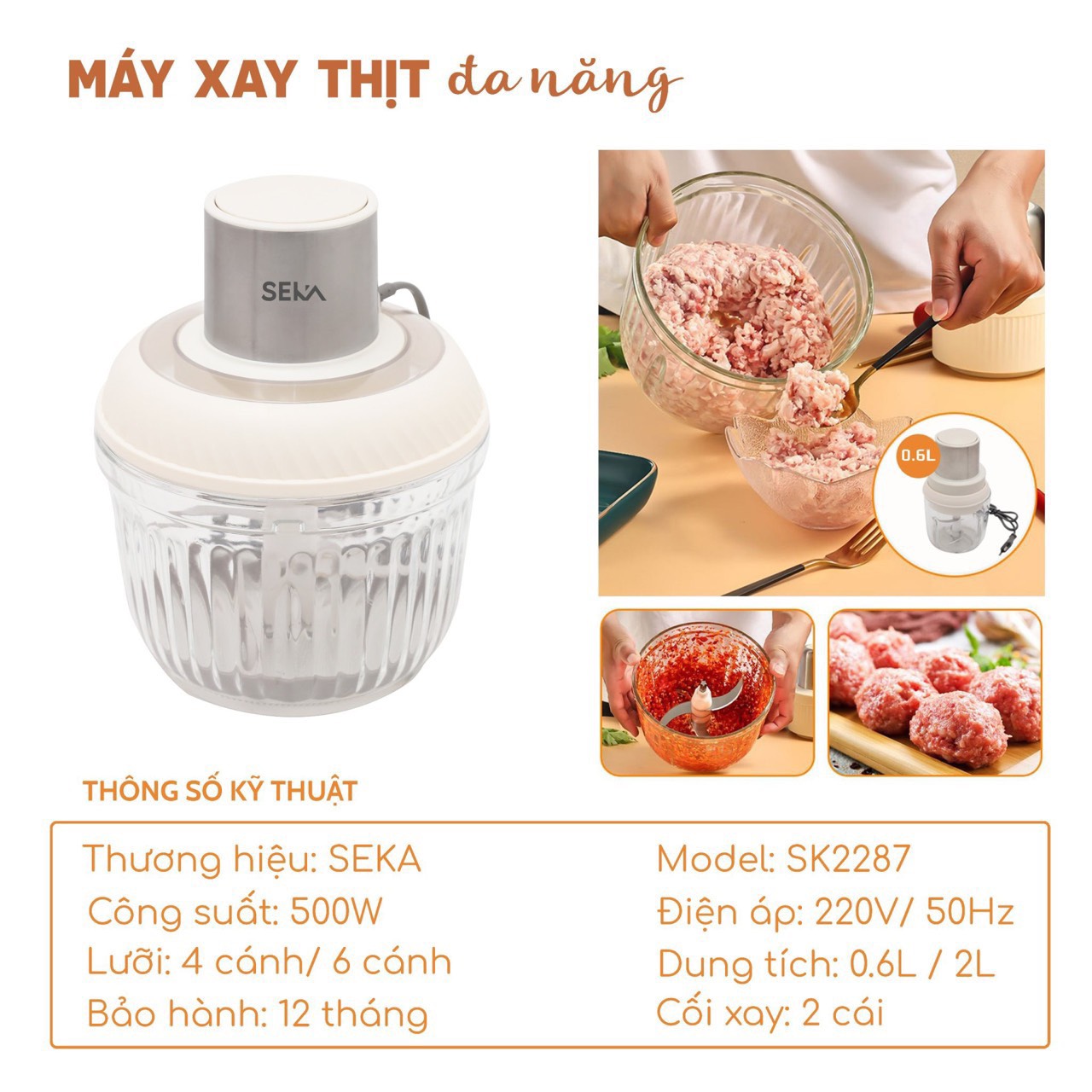 Máy xay thịt đa năng SEKA SK2287 chính hãng 2 cối thuỷ tinh, công suất 500W Việc nấu nướng mỗi ngày sẽ trở nên đơn giản, nhanh chóng hơn với Máy xay thịt SEKA SK2287, một "trợ thủ" gian bếp có thiết kế hiện đại, đa năng mang đến những món ăn ngon đầy đủ dinh dưỡng cho gia đình. I) THÔNG TIN SẢN PHẨM MÁY XAY THỊT SEKA SK2287 - Điện áp: 220V/50Hz - Công suất: