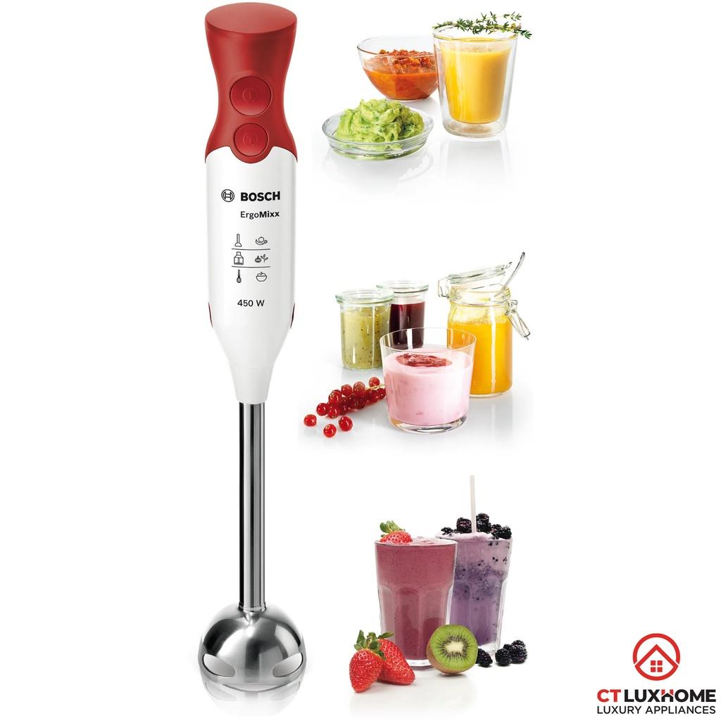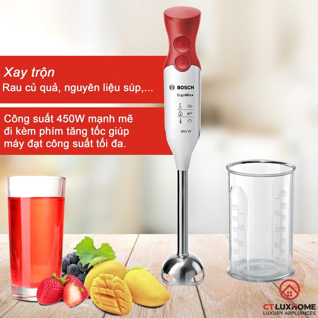 Máy xay sinh tố Bosch thiết kế kiểu cầm tay gọn gàng, nhẹ nhàng, có thiết kế chống trượt, cầm chắc tay, sử dụng tiện lợi Máy xay sinh tố đa năng hoạt động với