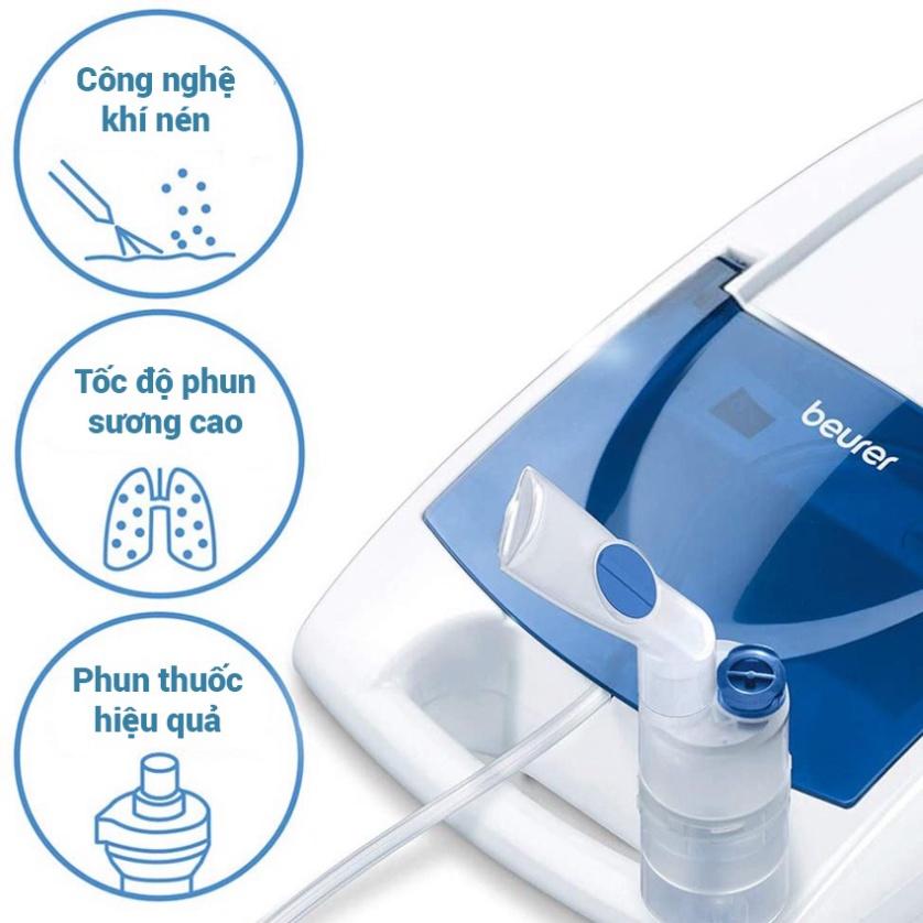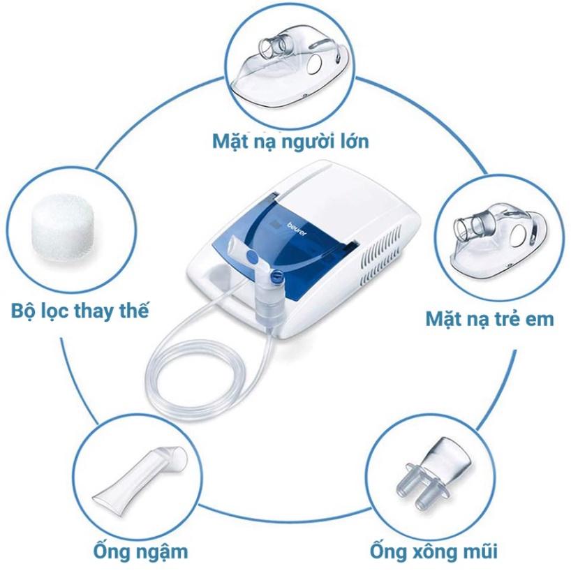 - Máy Xông Họng, Khí Dung Beurer IH18 đưa thuốc trực tiếp vào cơ thể dưới dạng hạt sương mù làm thông và loãng đờm, thấm sâu các lượng thuốc, muối sạch vào nang phế