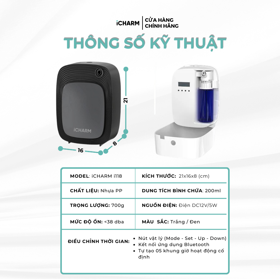 - Cài đặt dễ dàng/Bật tắt tự động: Máy có khả năng hoạt động 24/24 & cài đặt thời gian sử dụng linh hoạt, bật tắt tự động, và có thể điều chỉnh trực tiếp trên máy. Ngoài ra còn có thể điều chỉnh bằng app. Thông số máy xông tinh dầu cao cấp iCHARM i118 Model: iCHARM i118 Chất liệu: Nhựa PP cao cấp Bình chứa tinh dầu 200ml Nguồn điện: DV12V Công suất: 8W Độ ồn: < 38dba Kích thước: 15680210mm Không gian sử dụng 40-120m2 Là máy tạo mùi thơm cho mọi không gian Với khả năng khuếch tán mạnh mẽ và hiệu quả trên diện tích lớn, iCHARM i118 giúp duy trì mùi hương dễ chịu trong các không gian như văn phòng, khách sạn, spa, và nhà hàng….