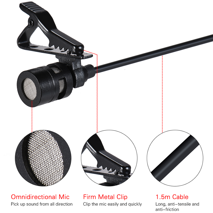 - Micro bao gồm jack 3.5mm TRRS cho Apple iPhone, iPad, iPod Touch, Android & Windows Phone, đảm bảo hoàn hảo chất lượng âm thanh. Độ dài dây 1.5m. Thông số kỹ thuật Mã Clip-on Lapel Microphone Loại micro Có dây Độ dày dây 1.5m Kết nối Apple iPhone, iPad, iPod Touch, Android. DSLR, máy quay phim, PC, smart phone