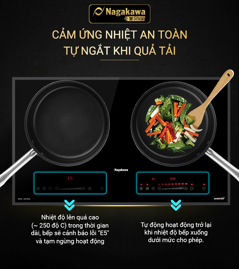 Chức năng chống quá nhiệt góp phần bảo vệ bếp đôi điện từ hồng ngoại Nagakawa NAG1252M, không cho phép sử dụng bếp khi nhiệt độ quá cao.