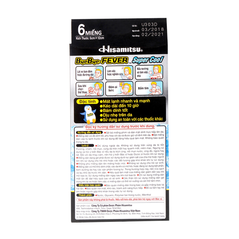 Miếng dán Bye Bye - Fever Super Cool có tác dụng hạ sốt và làm mát nhanh trong các trường hợp lái xe đường dài, làm việc, sau khi chơi thể thao, trời oi bức hoặc khi bị bầm tím. Hiệu quả kéo dài đến 10 giờ, miếng dán còn có độ bám dính tốt và hoàn toàn dịu nhẹ cho da.