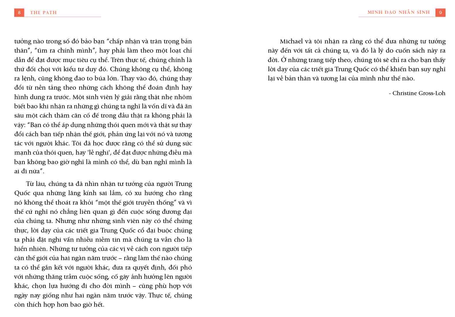 Michael Puett là giáo sư môn Lịch sử Trung Quốc, đồng thời là Chủ tịch Ủy ban Nghiên cứu Tôn giáo ở Đại học Harvard. Tại Harvard, các lớp học của GS. Michael Puett được nhiều sinh viên yêu thích theo học đứng thứ ba toàn trường, chỉ sau Kinh tế học và Khoa học Máy tính. Điều đó chứng minh tư tưởng triết học phương Đông cổ đại không chỉ không khó tiếp cận, mà còn thu hút đông đảo giới trẻ, kể cả những người quan tâm đến triết học hiện đại. Trước khi có những bài giảng của GS. Michael Puett và cuốn sách “Minh đạo nhân sinh”, nhiều người phương Tây nghĩ rằng triết học Phương Đông cổ đại là điều gì đó rất “cũ kỹ” và xa rời hiện thực. Họ cho rằng những triết lý phương Đông nói chung đặt niềm tin vào một kiểu trật tự cố định trong đời sống và con người phải sống theo “mệnh” của mình, hoặc đơn giản hơn là …bỏ đi tất cả, quay về với lối sống gần gũi với thiên nhiên. Nhưng sự thật là các triết gia Trung Quốc nhìn thế giới theo một cách rất khác: Họ cho rằng thế giới là một chuỗi vô tận những cuộc gặp gỡ phân mảnh, lộn xộn. Và thế giới quan này bắt nguồn từ quan niệm cho rằng tất cả các khía cạnh của đời sống con người đều bị chi phối bởi cảm xúc, bao gồm tất cả những tương tác vô tận giữa người với người đang diễn ra. Trong cuốn sách “Minh đạo nhân sinh”, GS. Michael Puett đã hệ thống, giảng giải những triết lý của các triết gia Phương Đông dễ hiểu một cách đáng kinh ngạc. Michael Puett chỉ ra rằng, từ 2.000 năm trước, các triết gia Trung Hoa cổ đại như Khổng Tử, Lão Tử, Mạnh Tử, Trang Tử, Tuân Tử, Quản Tử … đã có những phát kiến tuyệt vời về việc phát triển con người và thay đổi xã hội một cách hài hòa, tích cực. Khác với những hiểu lầm về quan điểm “thuận theo tự nhiên” hoặc các quan điểm ủy mị hoài tưởng về các xã hội cũ, tư tưởng cấp tiến của những triết gia phương Đông thể hiện ở quan điểm sự biến đổi tích cực không đến từ việc tìm kiếm một con người “thật sự” - vốn có sẵn mà đến từ việc tạo ra các điều kiện mới. Trong đó, trọng tâm trong tư tưởng của Khổng Tử và nhiều nhà triết học cổ đại là mối quan hệ tốt không chỉ đến từ sự chân thành bên trong, mà còn đến từ những “nghi thức” chúng ta thực hiện trong đó. Vì vậy, việc tu dưỡng đạo đức, tự rèn luyện bản thân là tối quan trọng. Hay nói cách khác, không có lối mòn nào là đúng đắn để chúng ta đi theo ngay từ đầu mà chỉ có quá trình tu dưỡng để trở nên tốt hơn phù hợp với từng giai đoạn và thời điểm. Ngoài việc chọn lọc và đúc kết một cách khúc triết những quan điểm hay nhất, triết học phương Đông cổ đại “Minh đạo nhân sinh” còn là một tài liệu đáng để tham khảo với những ai đang tìm hiểu cổ học tinh hoa. Trong cuốn sách này, những điểm tương đồng, thậm chí khác biệt của các triết gia như Khổng Tử, Mạnh Tử, Tuân Tử… được GS. Michael Puett đưa ra phân tích, so sánh. “Minh đạo nhân sinh” ra mắt vào năm 2016, kể từ đó cuốn sách luôn lọt top bán chạy trong dòng sách của mình. Cuốn sách đạt danh hiệu “International Best-seller” (sách bán chạy quốc tế) và lọt vào danh sách bán chạy nhất mà tờ The New York Times và Sunday Times bình chọn. Về tác giả Michael Puett là giáo sư môn Lịch sử Trung Quốc của khoa Ngôn ngữ và Văn minh Đông Á, đồng thời là Chủ tịch Ủy ban Nghiên cứu Tôn giáo ở trường Đại học Harvard. Ông đã được trao tặng giải thưởng Harvard College Professorship vì đóng góp xuất sắc cho sự nghiệp giảng dạy đại học và là một thành viên của Viện Hàn lâm Khoa học Hoàng gia Thụy Điển. Còn Christine Gross-Loh là một phóng viên và nhà văn. Cô tốt nghiệp tiến sĩ chuyên ngành lịch sử Đông Á tại trường Đại học Harvard. Tác phẩm của cô được đăng trên các báo The Wall Street Journal, The Atlantic và The Guardian.
