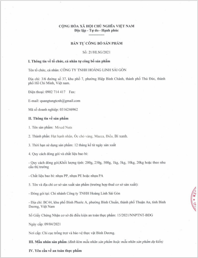 Thông tin hạt điều rang muối Bình Phước. - Thương hiệu: H Holinut Nuts & More - Phân phối bởi công ty TNHH HOÀNG LINH SÀI GÒN - Xuất xứ: Bình Phước (Việt Nam)