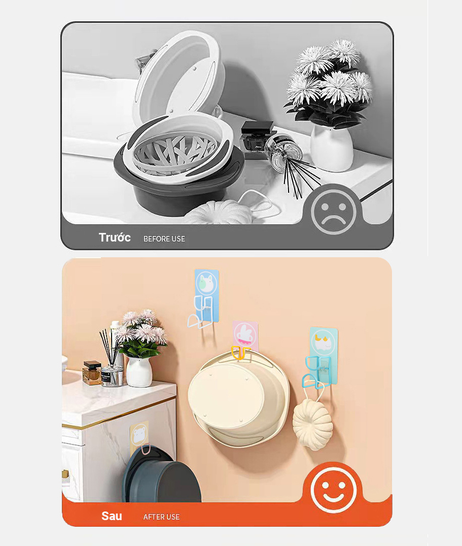 - Công dụng Móc treo dán tường: Móc treo đặc biệt có thể giữ nhiều thau chậu cùng lúc.