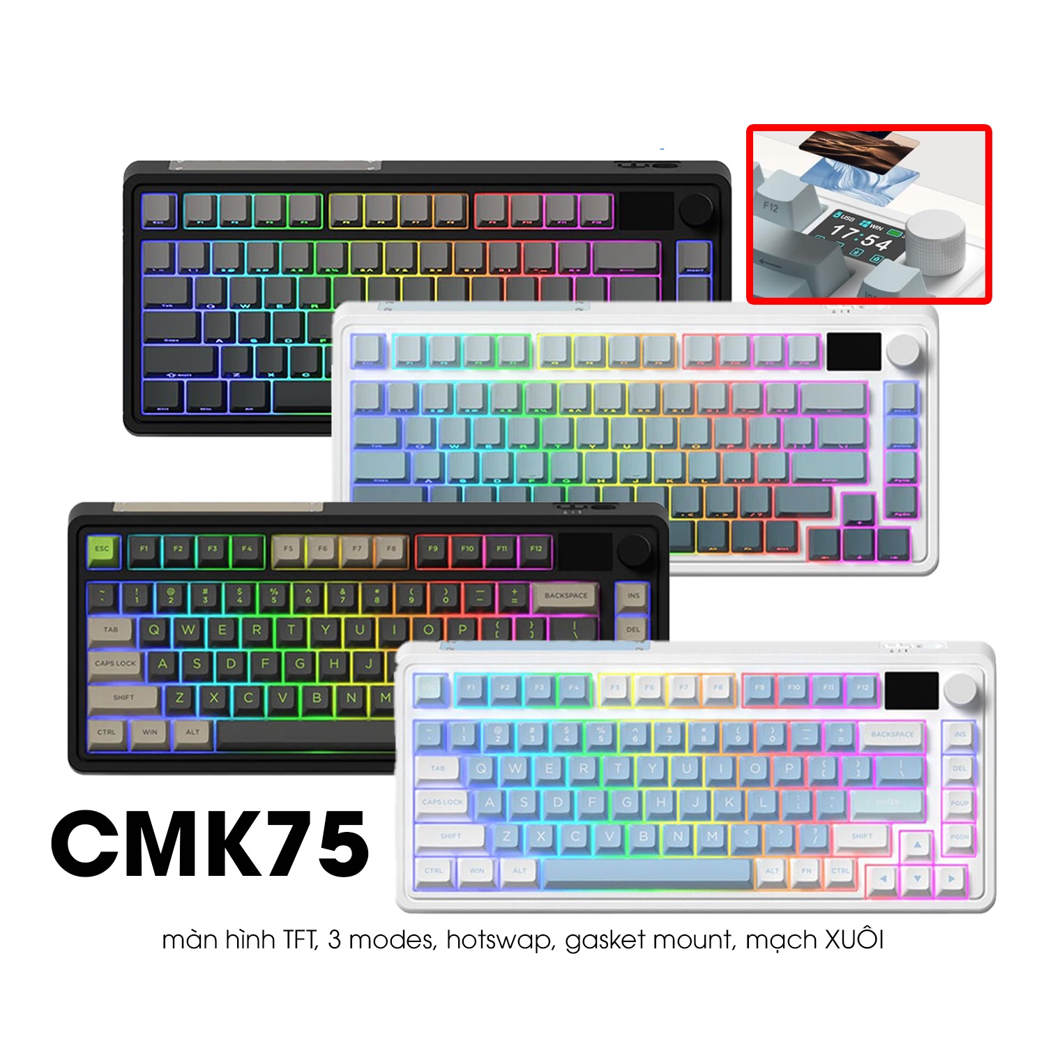 CMK75SAM được hãng FL·Esports vô cùng ưu ái. hãng đã mạnh dạn trạng bị thêm cho em bàn phím này màn hình hiển thị TFT đầy màu sắc. Màn hình TFT này sẽ hiển thị các cài đặt khác nhau như ngày, giờ, chế độ hệ thống đang hoạt động, chế độ kết nối,…Nó cũng có thể được tùy chỉnh với các hình ảnh và hoạt ảnh gif khác nhau. Người dùng có thể tải tối đa 5 hình ảnh và 1 ảnh động gif trên cấu hình bàn phím.