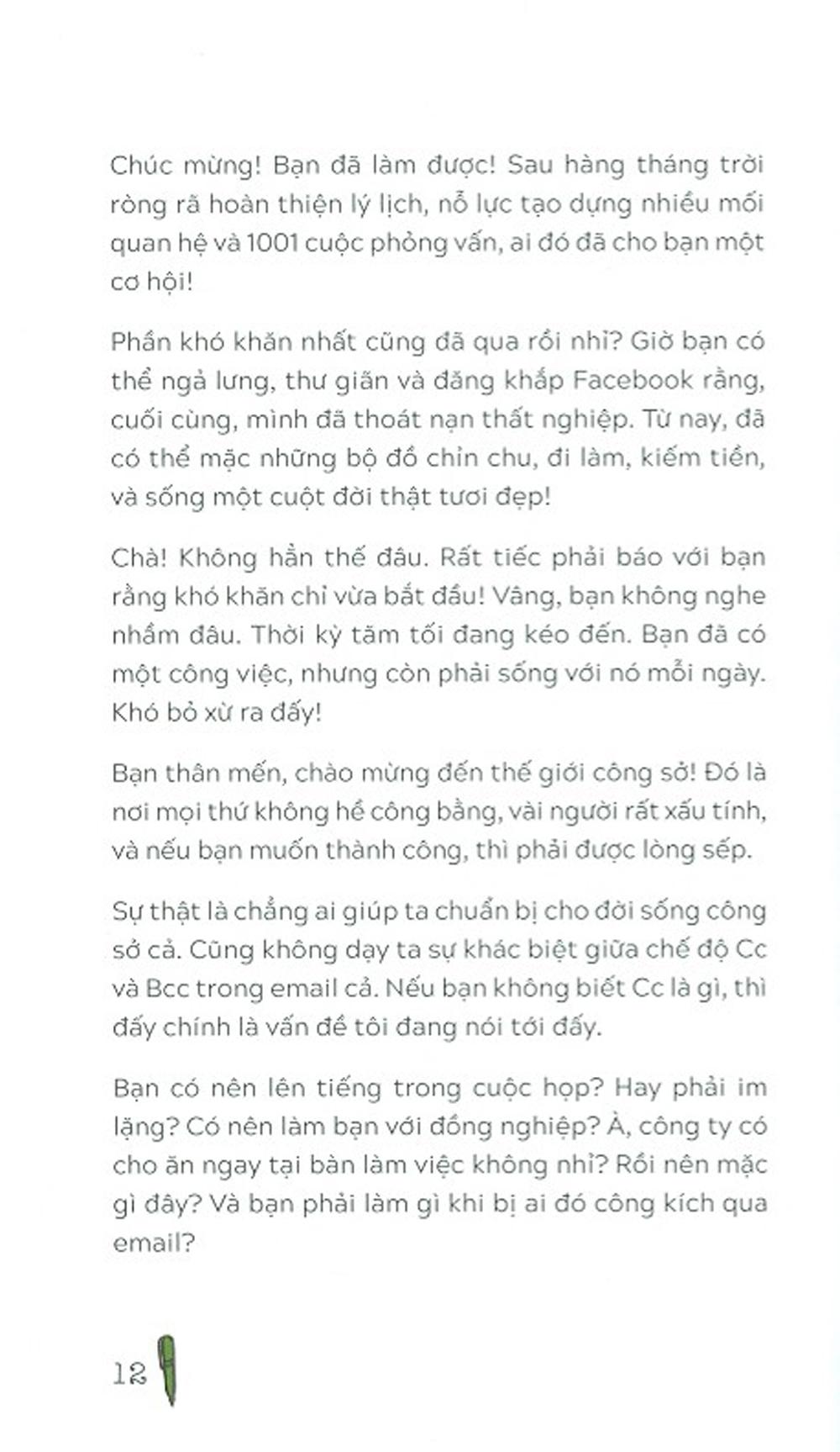 Đặt chân vào thế giới công sở, bạn phấn khích, nôn nao, lo âu, mong chờ và choáng ngợp vì chẳng biết bản thân đang làm gì. Không bao lâu sau, bạn nhận ra rằng hầu hết những điều được học ở trường đều không thể giúp mình thành công tại công sở. Thậm chí, bạn còn không biết cách chỉnh ghế trong văn phòng sao cho đúng, huống hồ gì là tường tận thứ văn hóa công sở đa dạng, phức tạp. Cuối cùng, bạn cảm giác như thể mình đang làm việc ở một đất nước khác.
